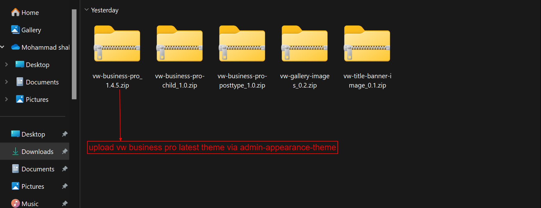 - The option to upload a zip file will appear after you click Add New Theme, Download the file vw business pro 1.3 zip (latest version).