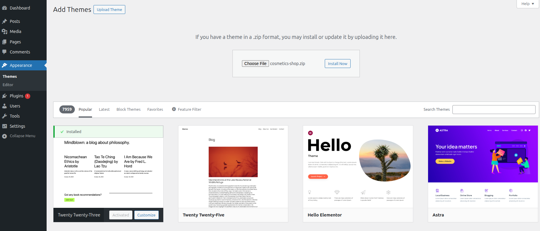 1.3. Press "Upload Theme" button then select your cosmetics-shop.zip theme then click on "install now".