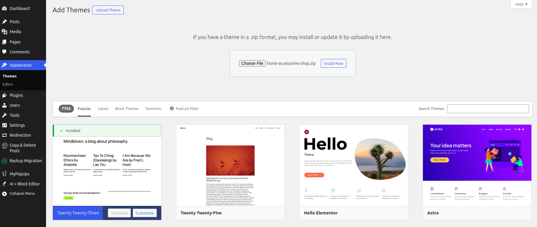 1.3. Press "Upload Theme" button then select your home-accessories-shop.zip theme then click on "install now".