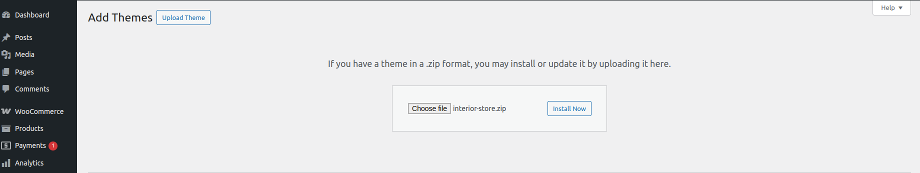 1.3. Press "Upload Theme" button then select your interior-store.zip theme then click on "install now".