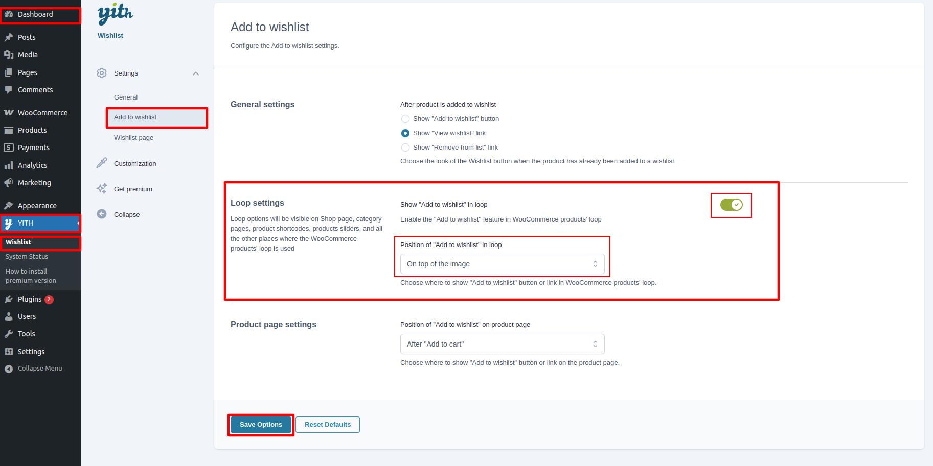 Enable "Show 'Add to wishlist' in loop" and set its position to "Top of the image".