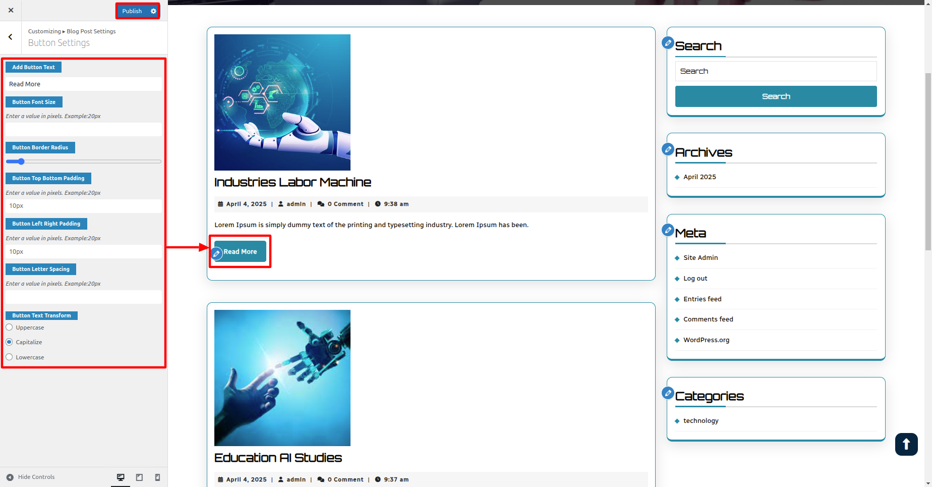 Go To Dashboard > Appearance > Customize > Blog Post Setting > Button Setting