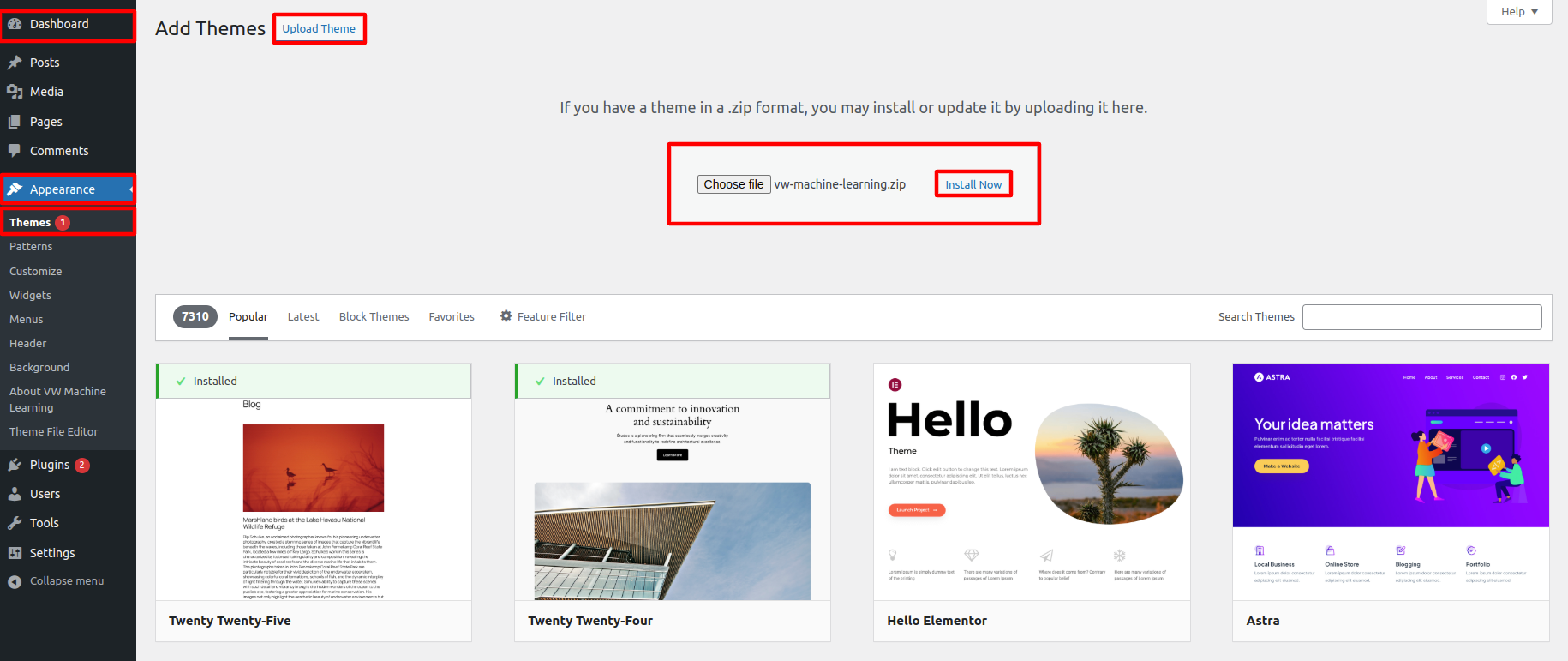 1.3. Press "Upload Theme" Click, then choose your vw-machine-learning.zip theme then Click on 'install now'.