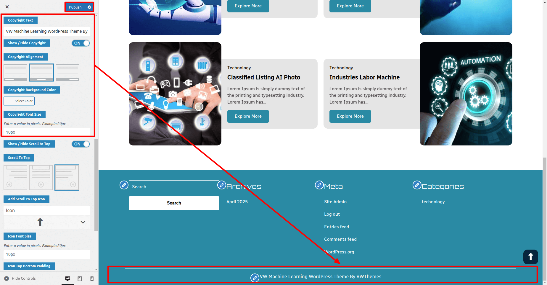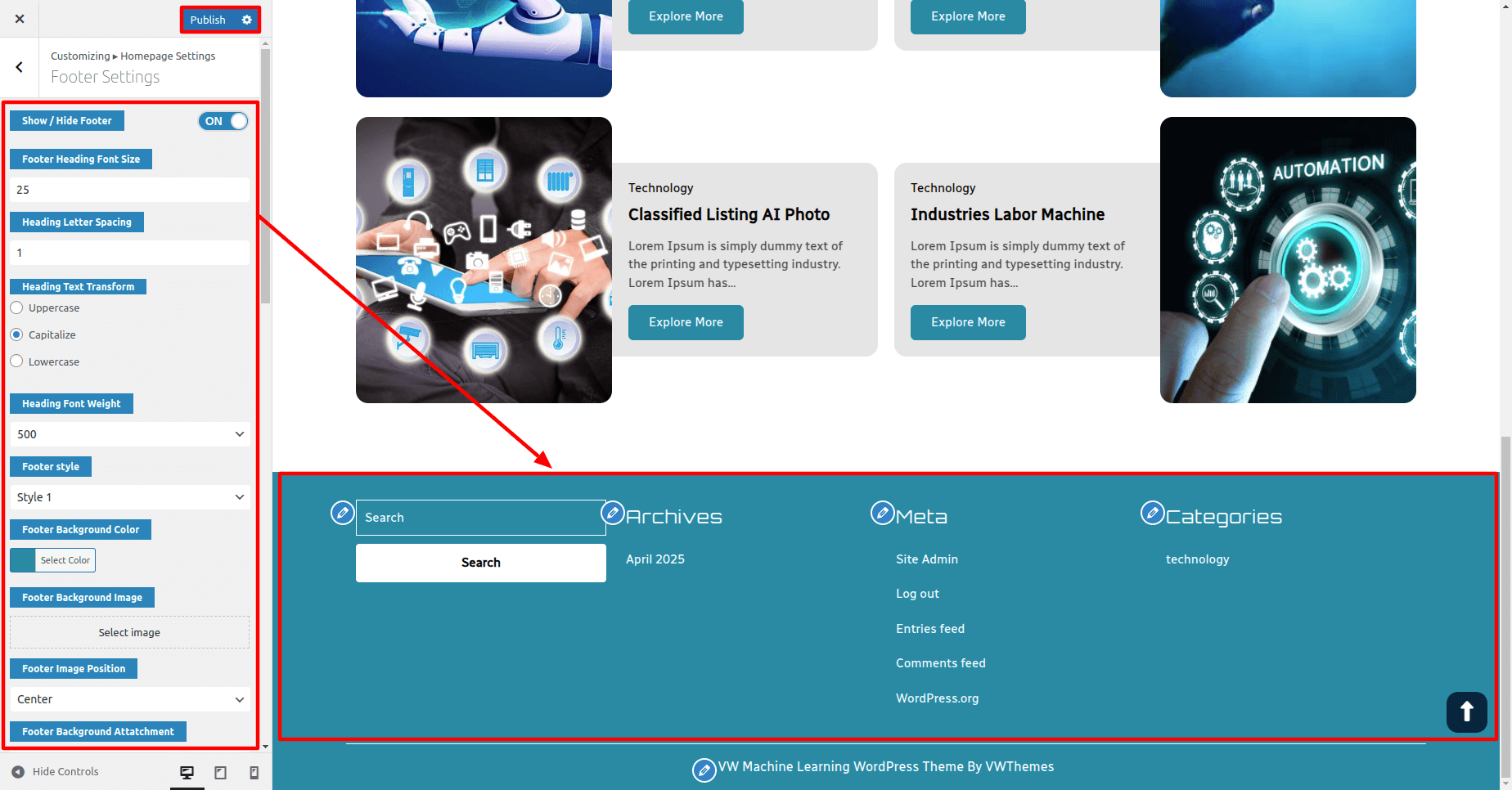 Go To Dashboard > Appearance > Customize > Homepage Settings > Footer Settings