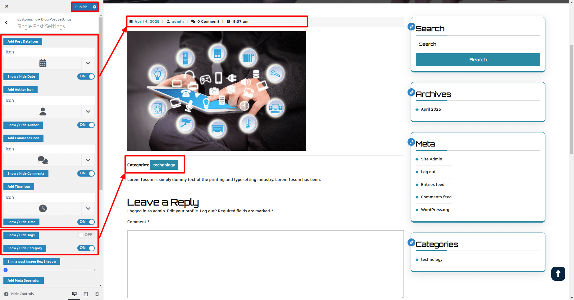 Go To Dashboard > Appearance > Customize > Blog Post Setting > Single Post Settings