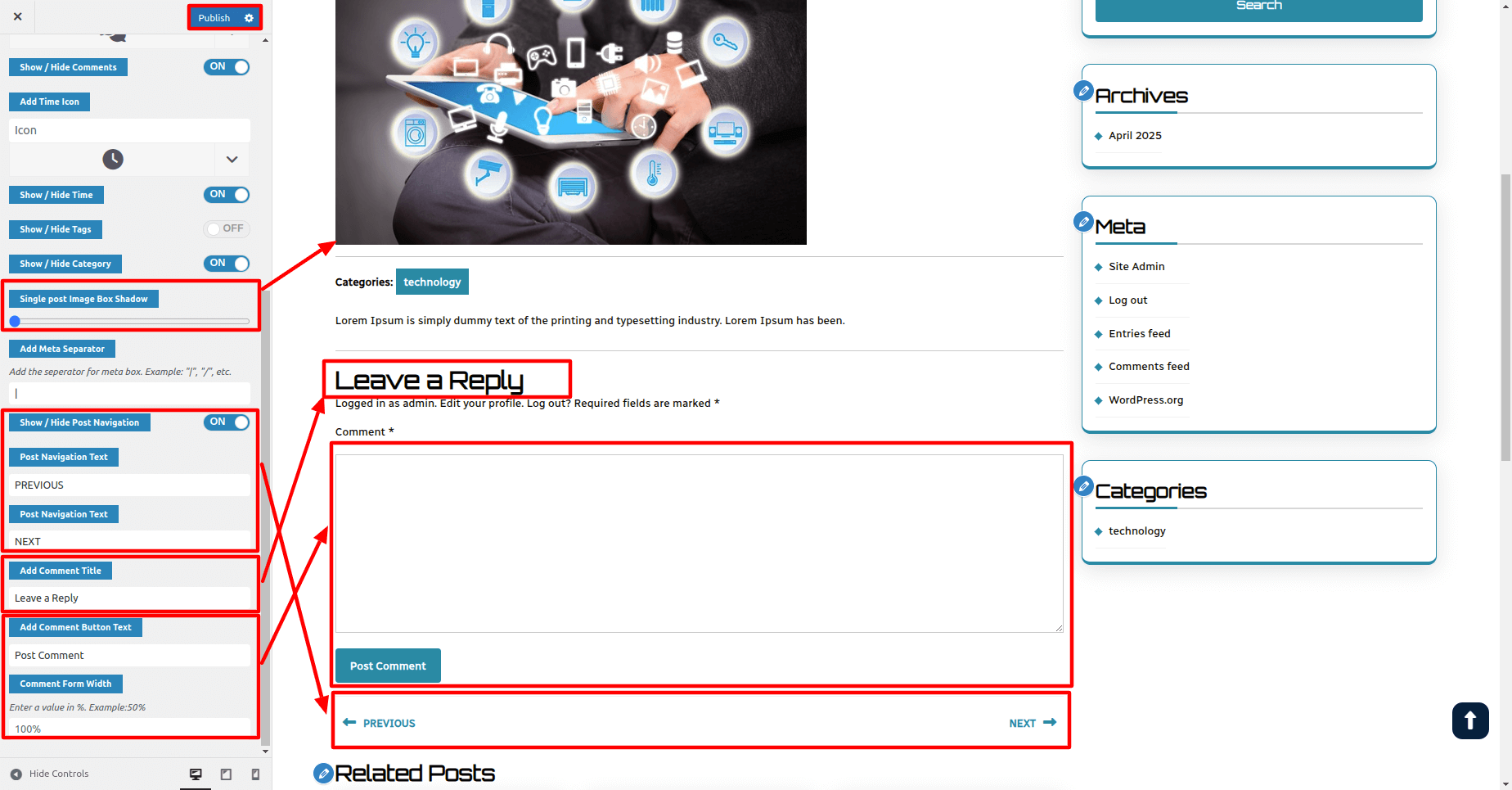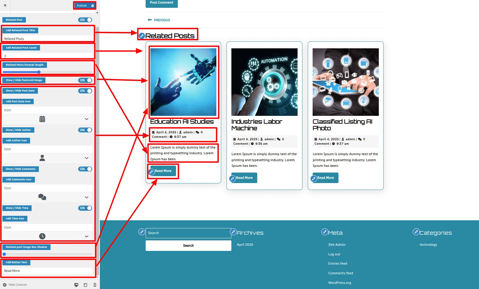 Here you have choices for related post title, Show/hide related post and related post count options.