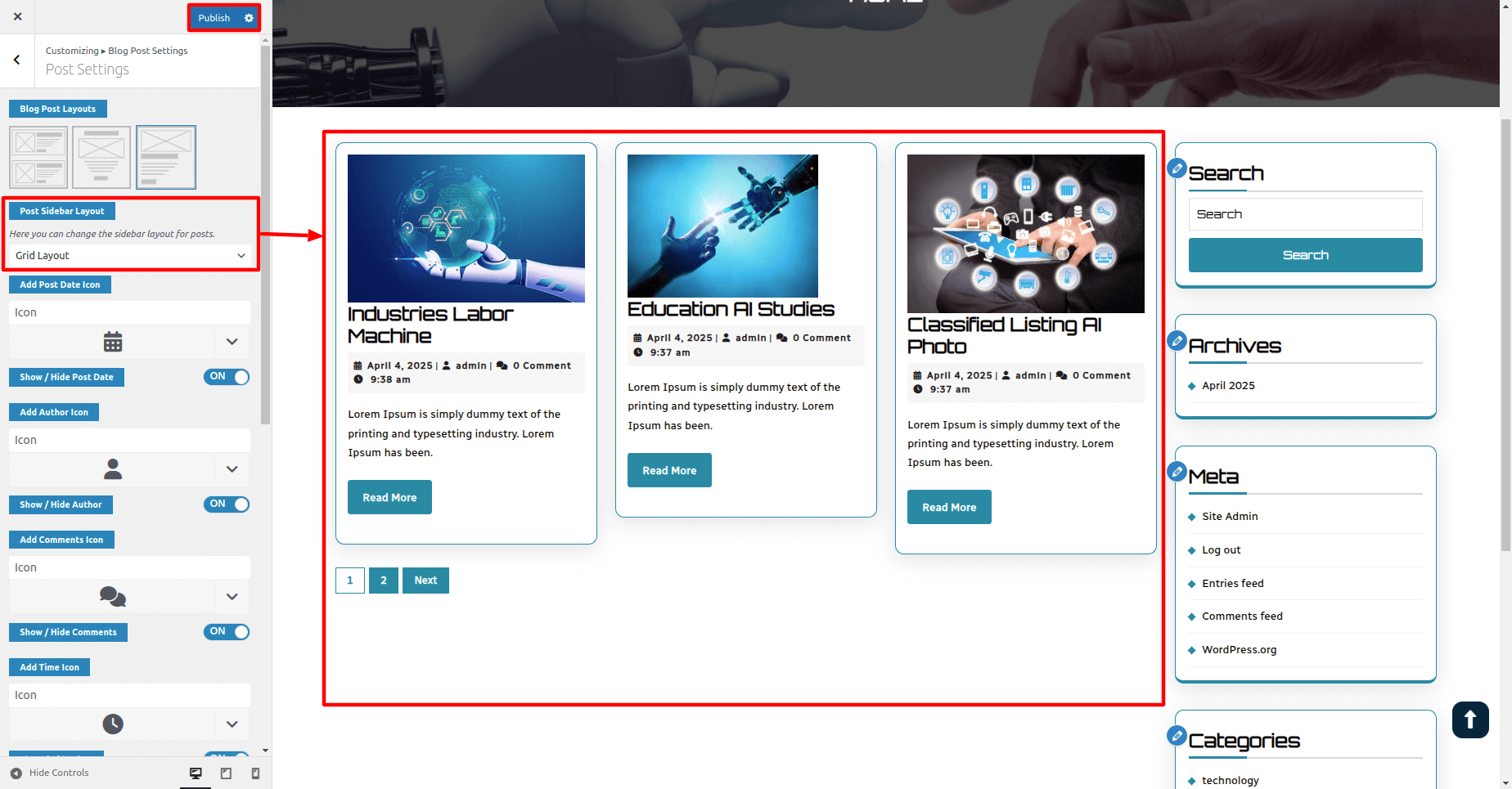 Go To Dashboard > Appearance > Customize > Blog Post Setting > Post Settings > Select Grid Layout