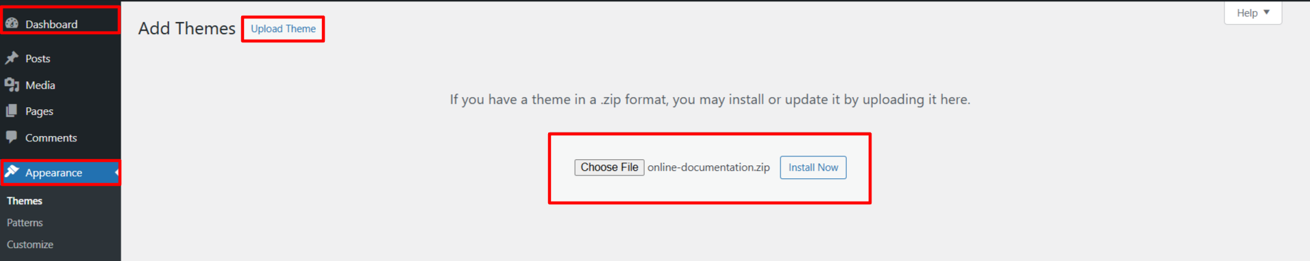 1.3. Press "Upload Theme" button then select your online-documentation.zip theme then click on "install now".