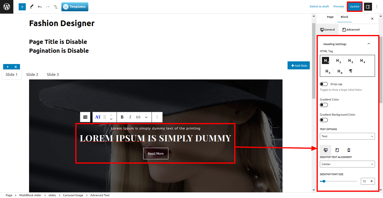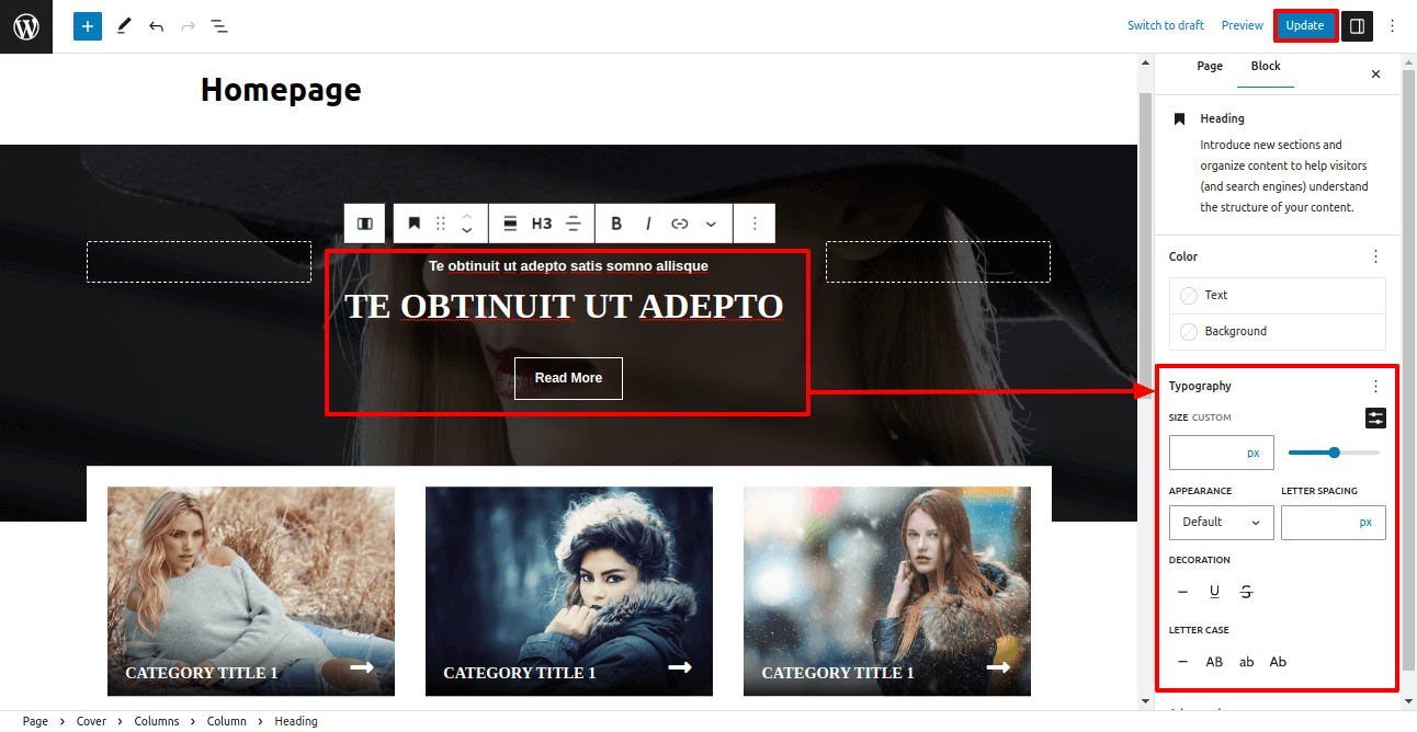 You can change heading tags, alignment options, font size, and line height through the editor.