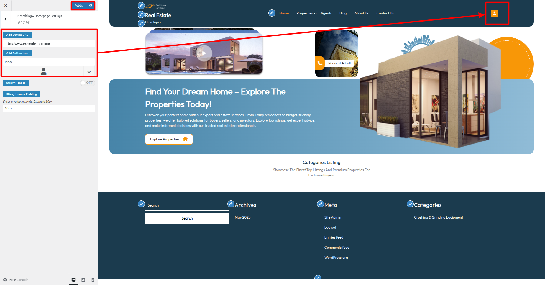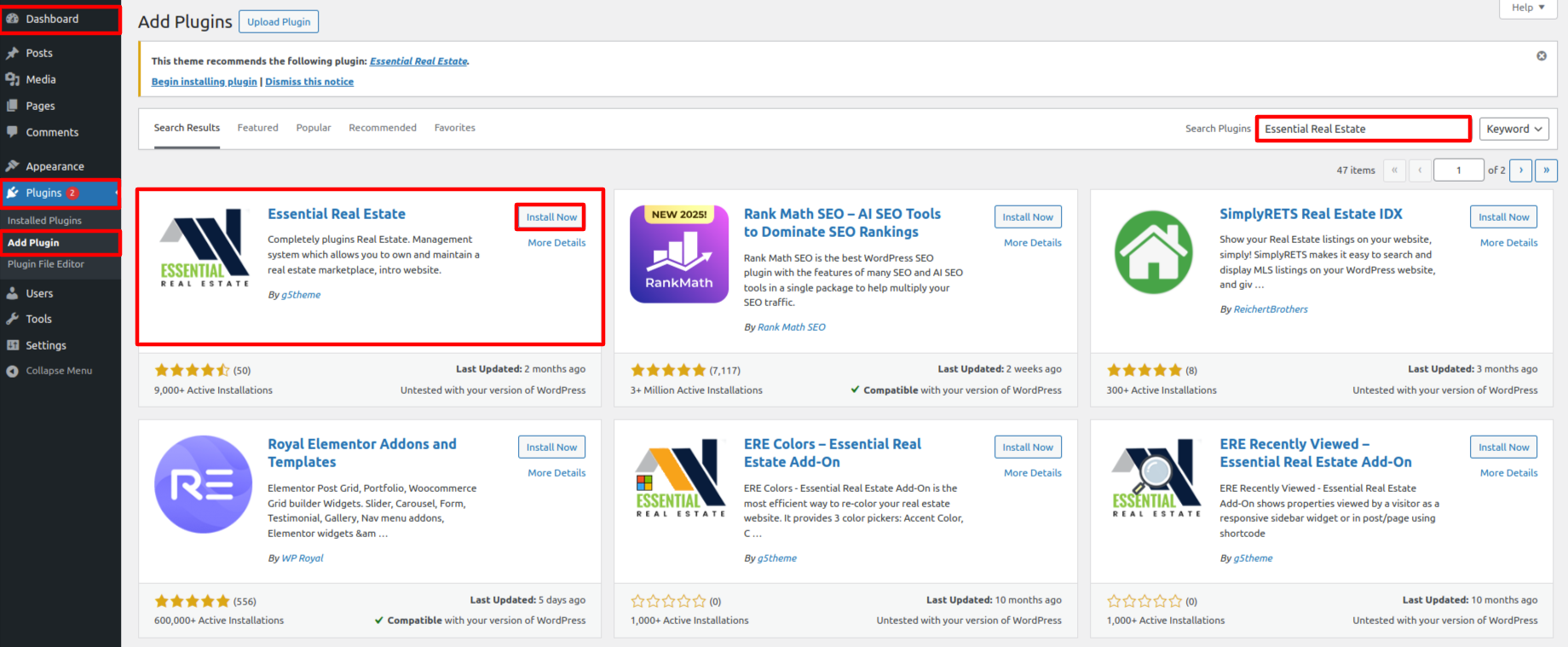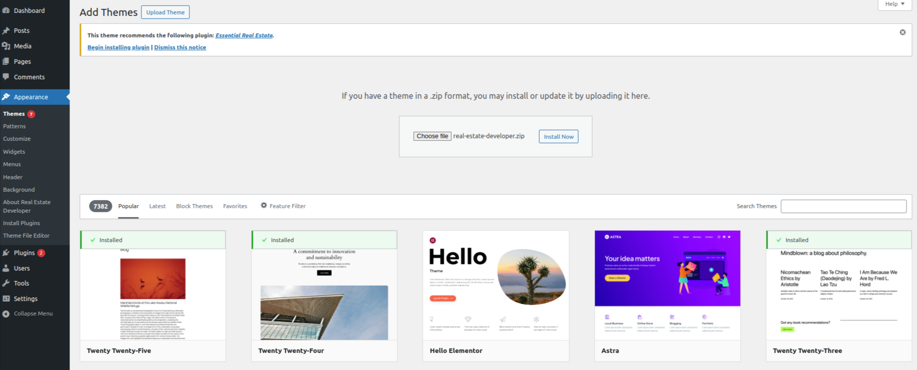 1.3. Press "Upload Theme" button then select your real-estate-developer.zip theme then click on "install now".