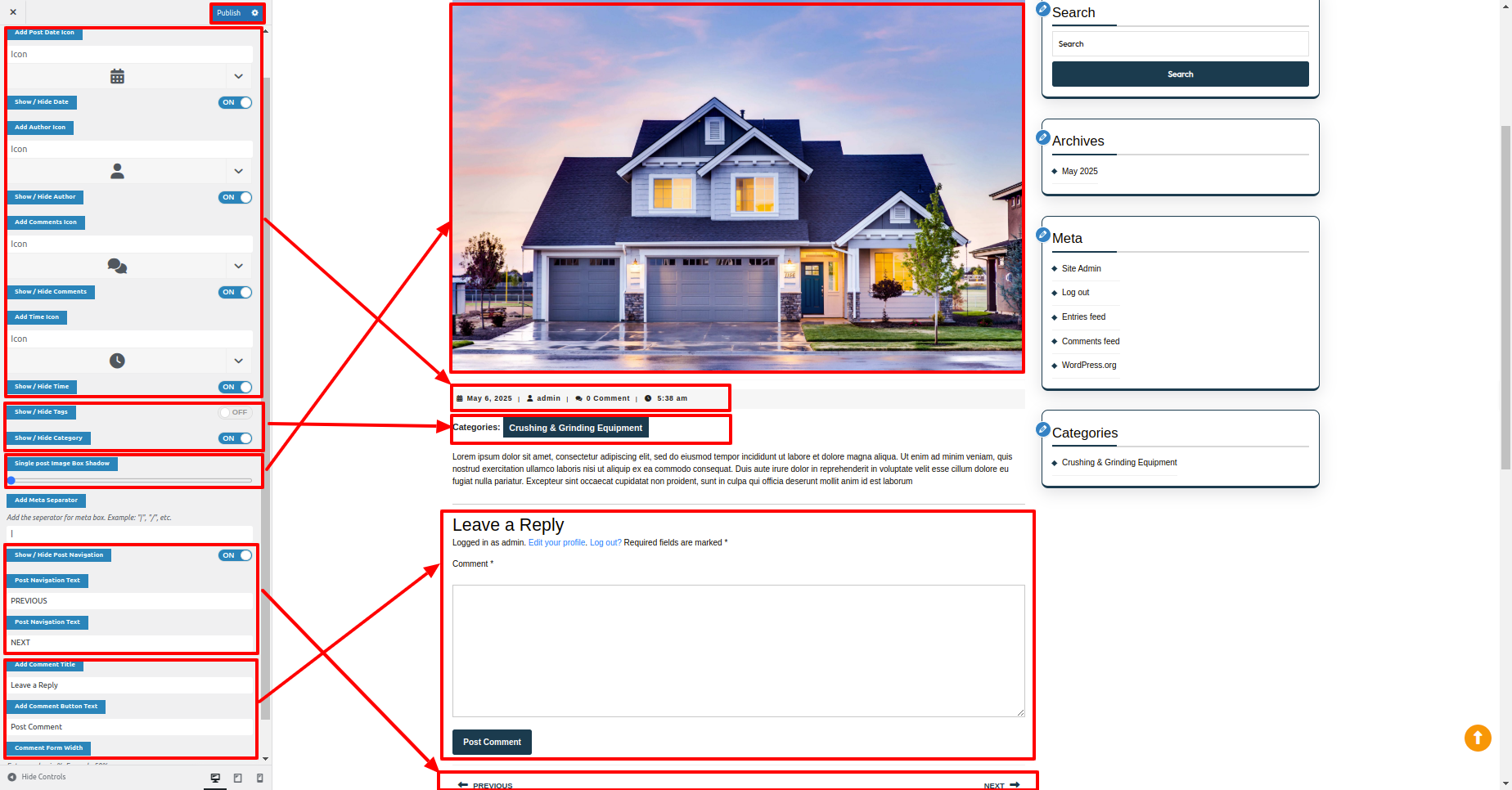 Here you have options for enable/disable author, date, comments, time and featured image respectively.