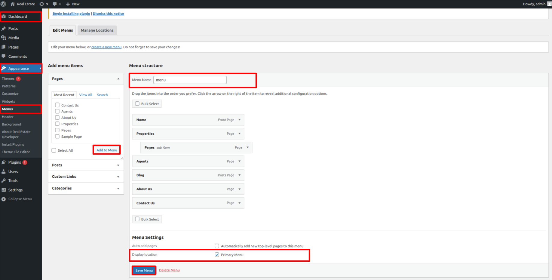 - Give your menu a name in the Menu Name field, then click the Save Menu button.