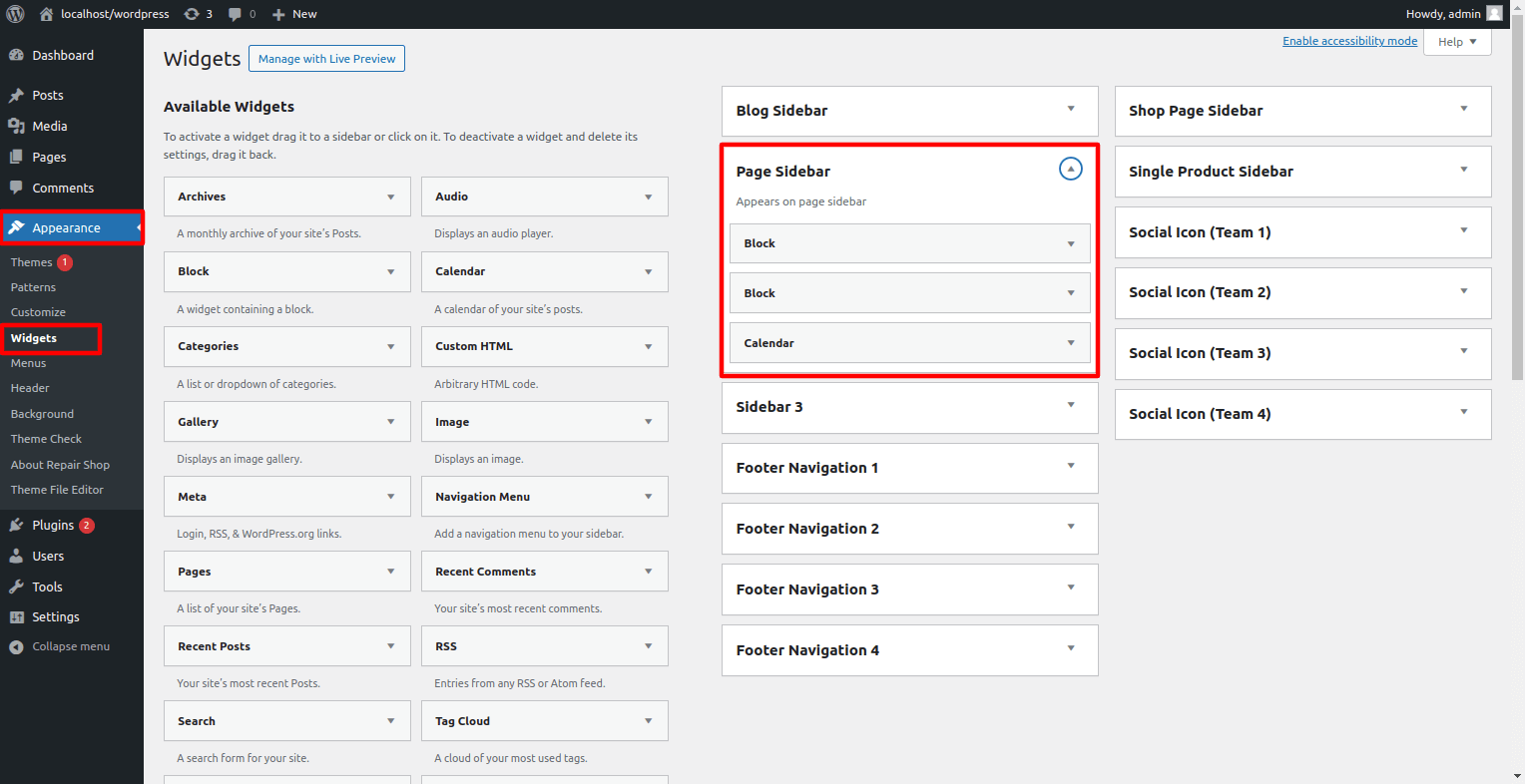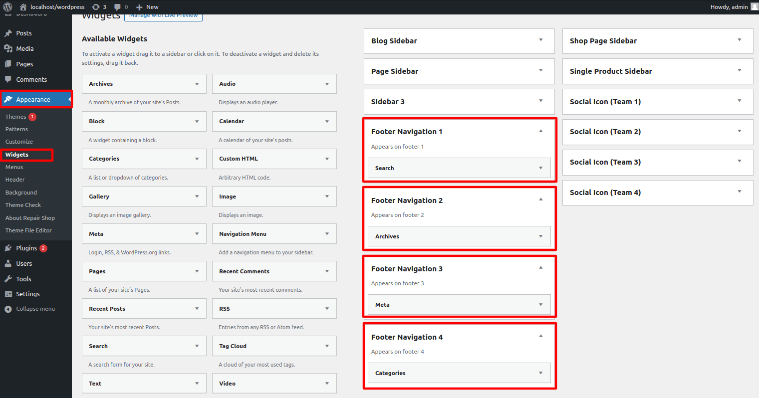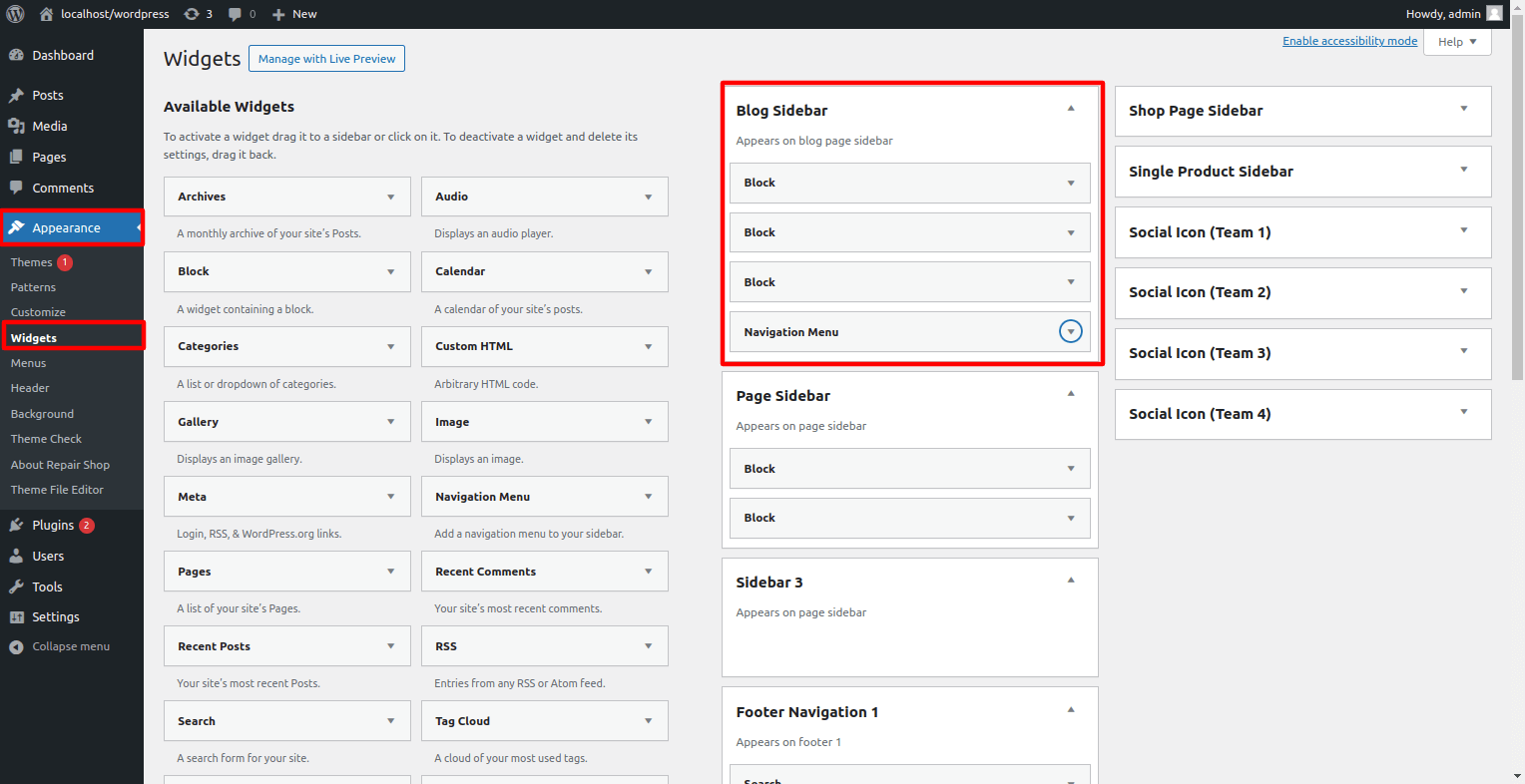 1. Dashboard > Appearance > Widgets