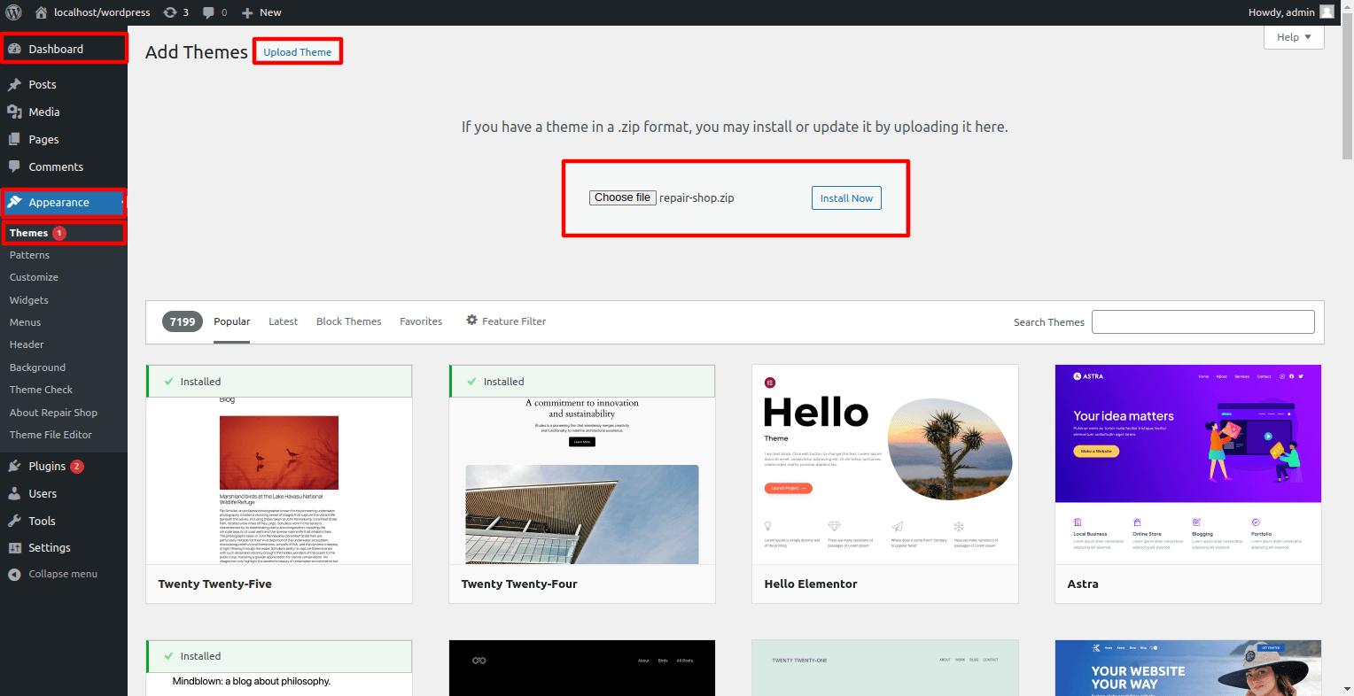 1.3. Press "Upload Theme" Click, then choose your repair-shop.zip theme then Click on 'install now'.