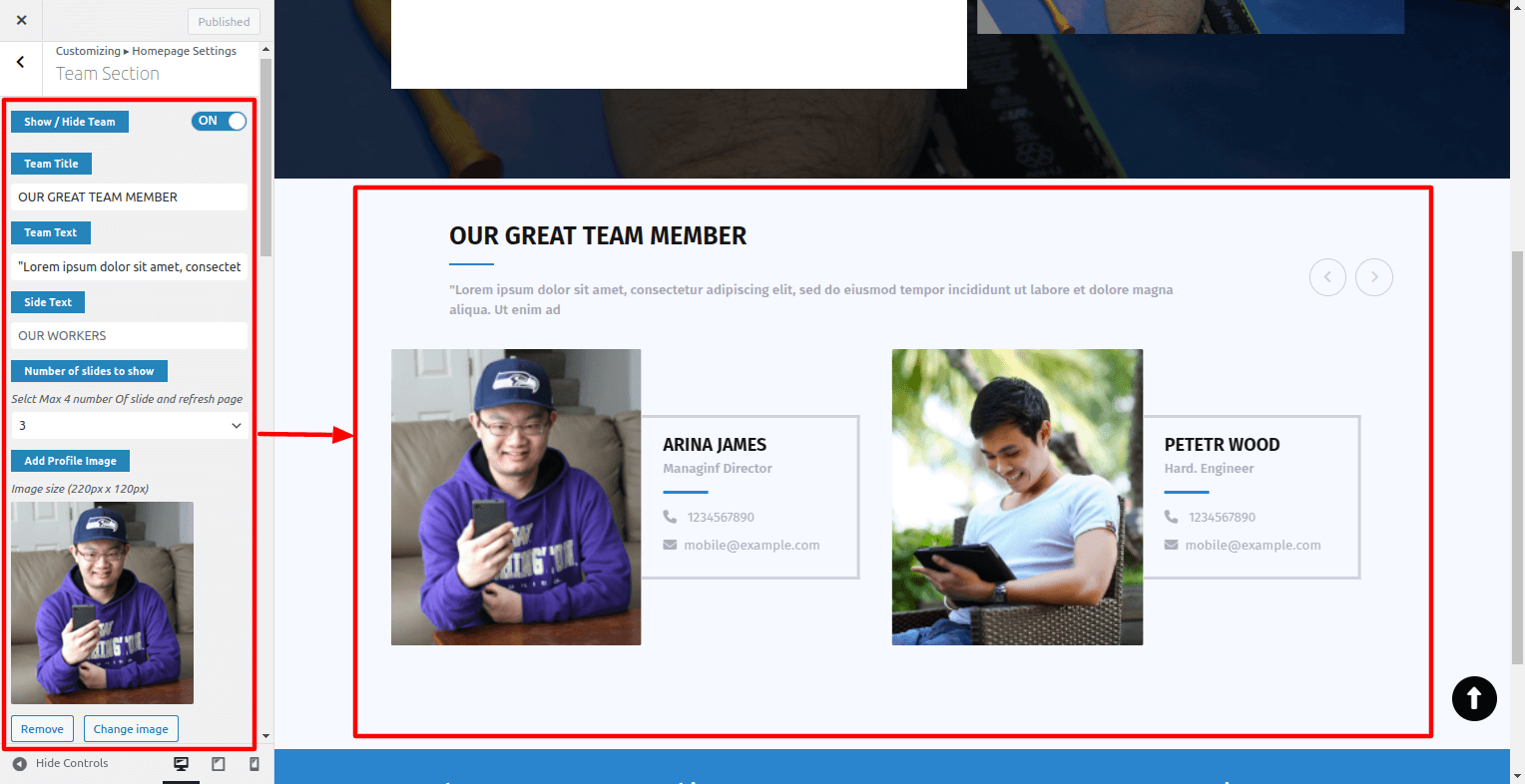 Go To Dashboard > Appearance > Customize > Homepage Settings > Team Section