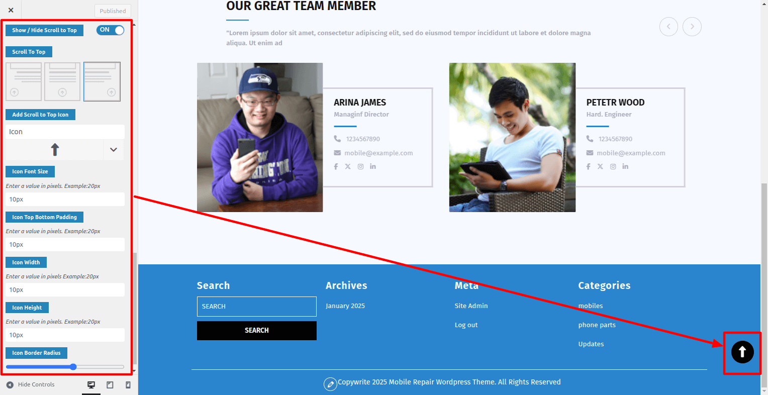 Here you can show / hide scroll to top, and you can change its position.