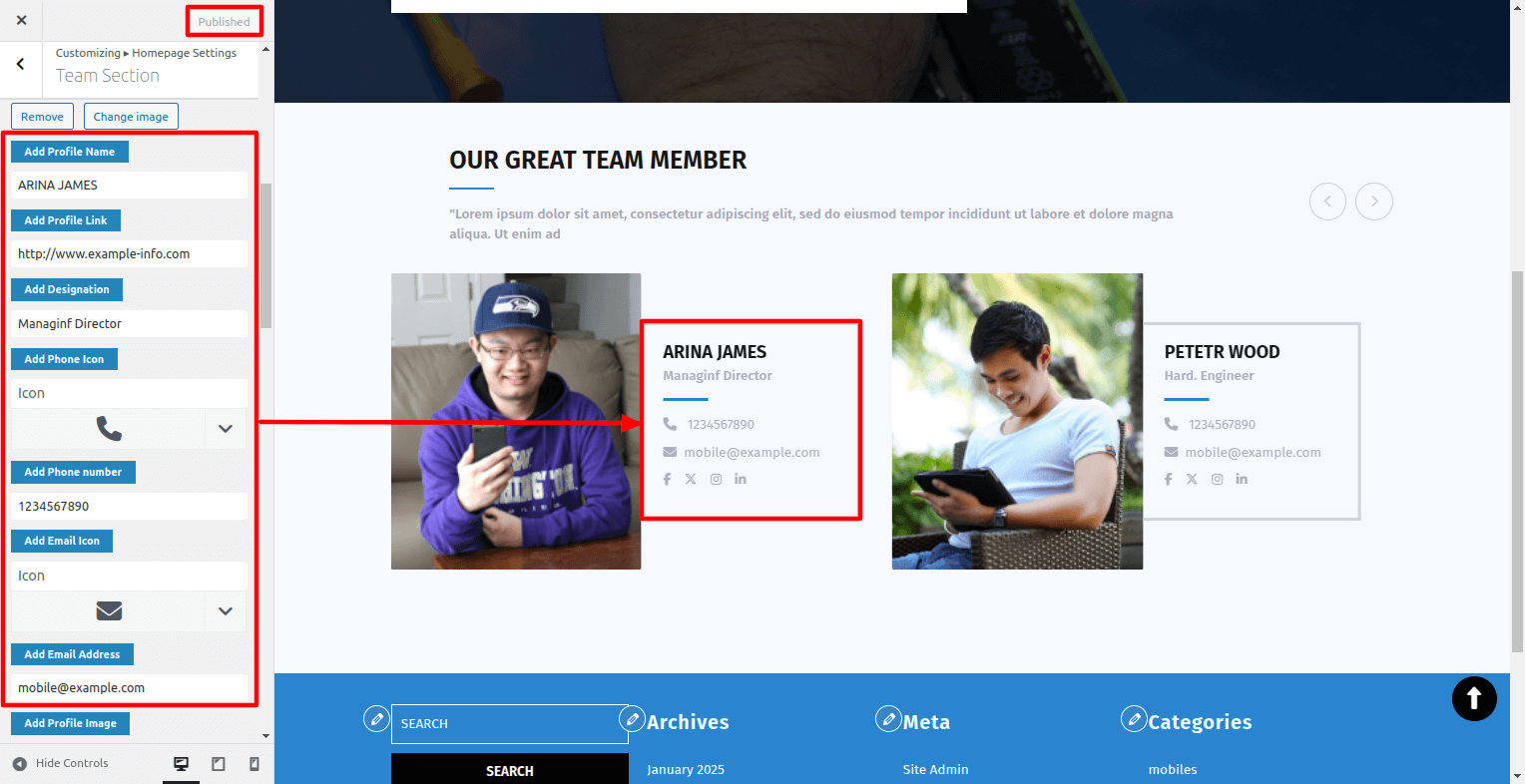 When setting up the Team Section's social icon, proceed as directed below.