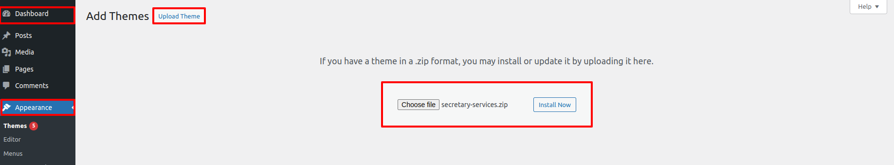 1.3. Press "Upload Theme" button then select your secretary-services.zip theme then click on "install now".