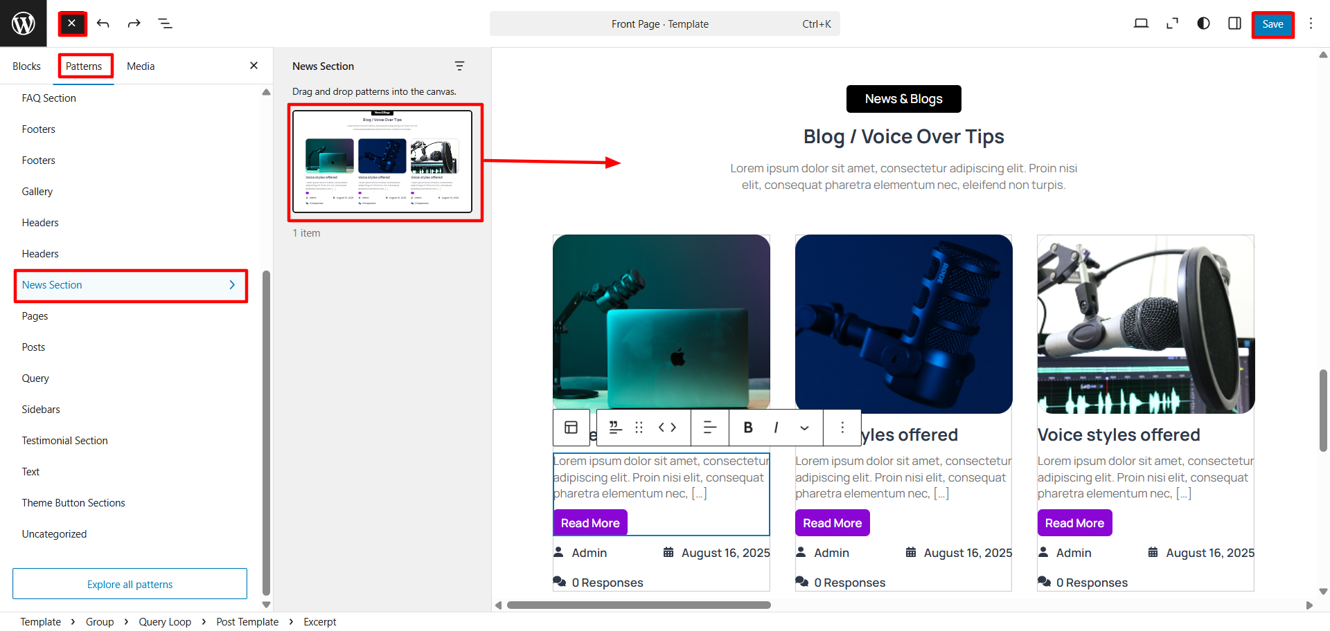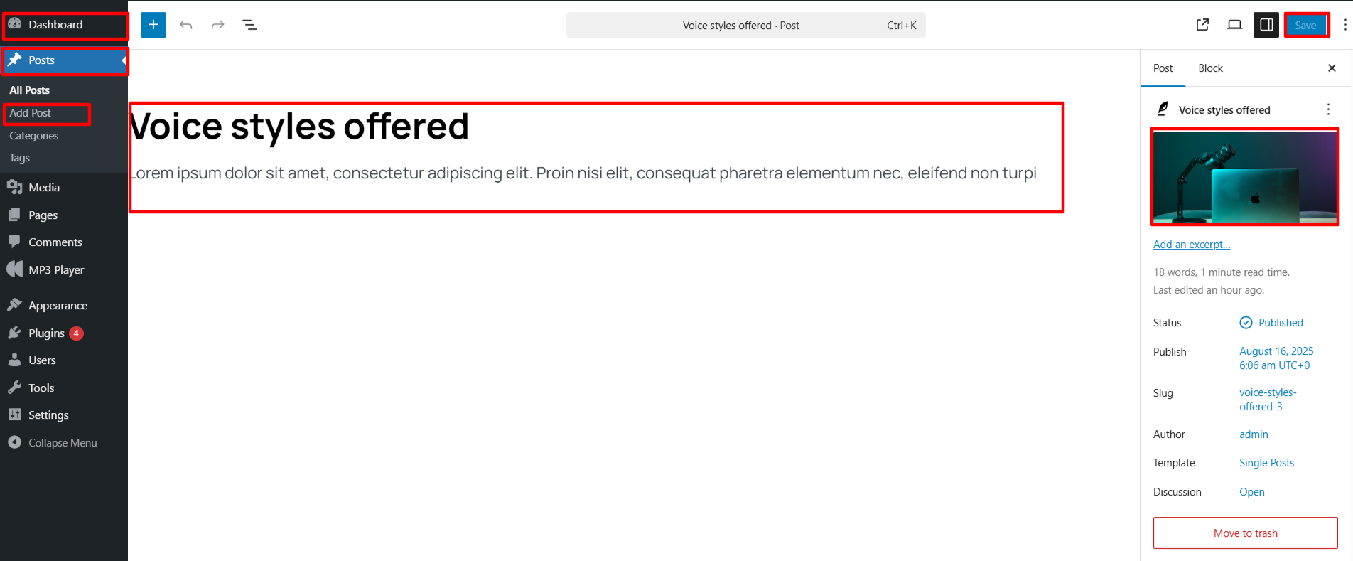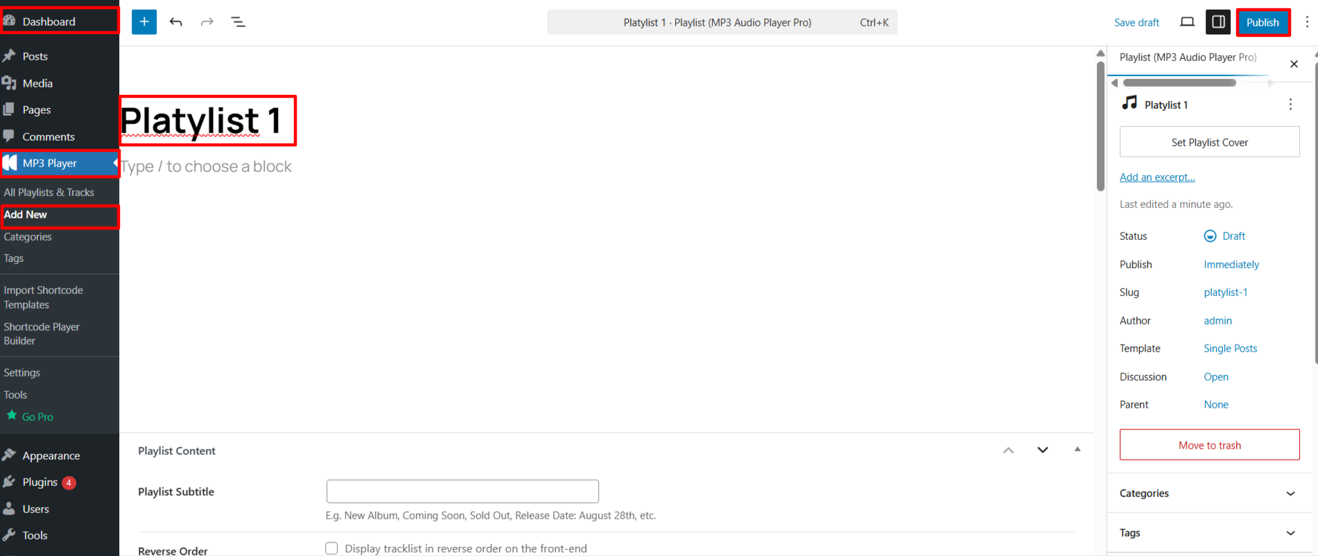 To display an audio player on the front page, you first need to install and activate the MP3 Audio Player by Sonaar plugin. Go To Dashboard >> MP3 Player >> Add New Enter a suitable title for your player as shown in the figure. Go to Track1 and Upload your audio track(s) to the playlist Set a cover image for the player to give it a professional look. Once done, click Publish. It will appear as such on the front end.
