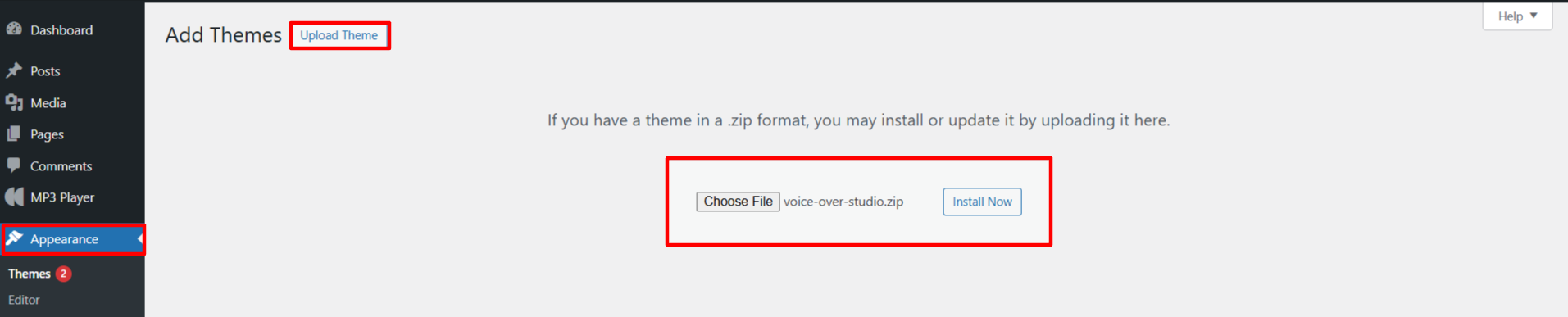1.3. Press "Upload Theme" button then select your voice-over-studio.zip theme then click on "install now".
