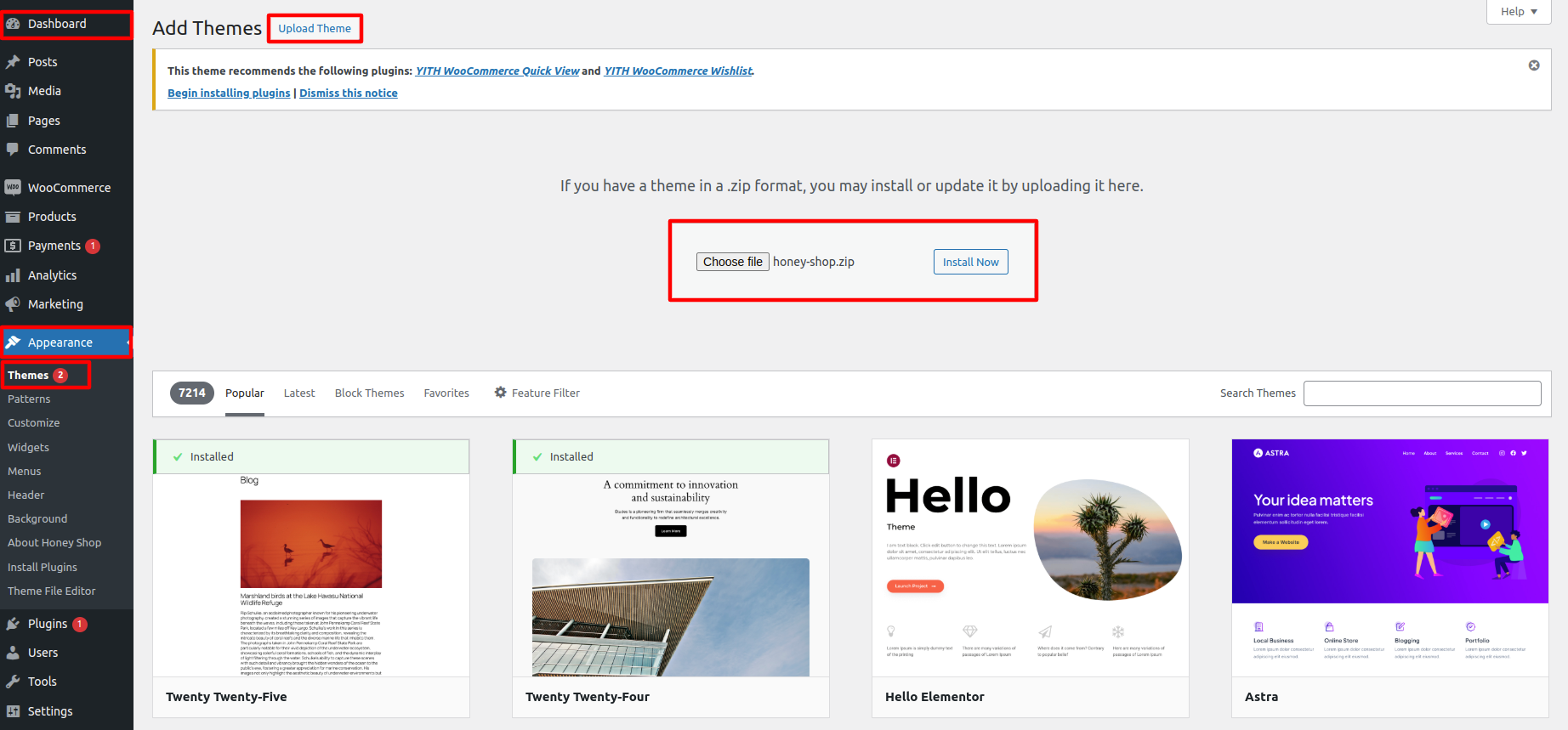 1.3. Press "Upload Theme" Click, then choose your honey-shop.zip theme then click on "install now".