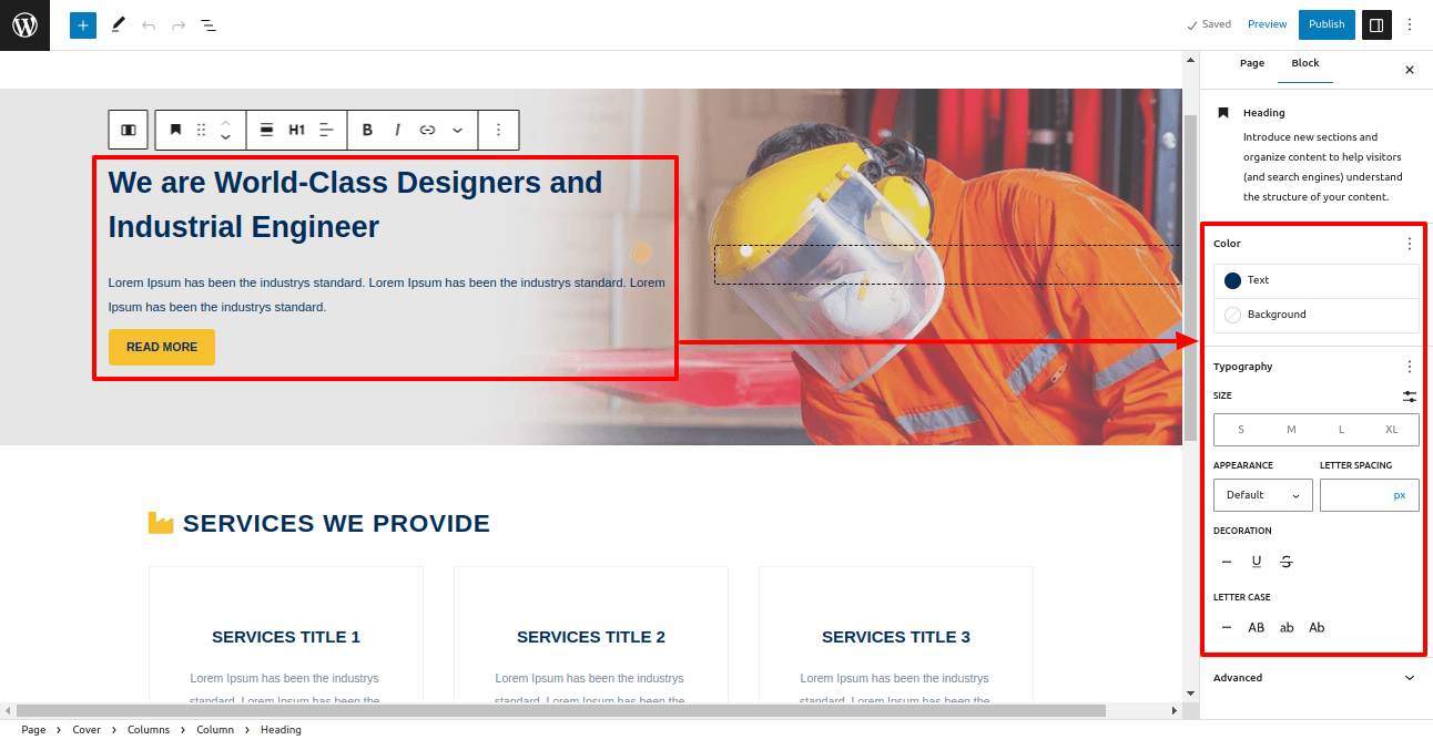You can change heading tags, alignment options, font size, and line height through the editor.