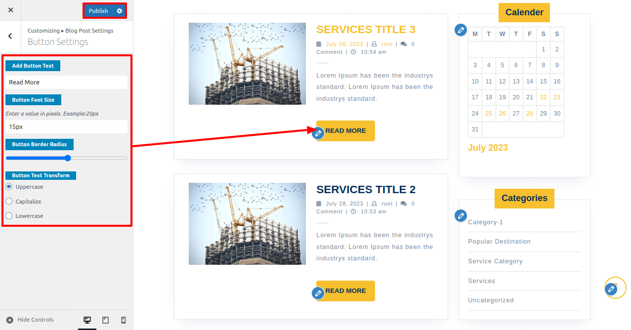 Here you have options for blog post button padding, border radius and button text options.