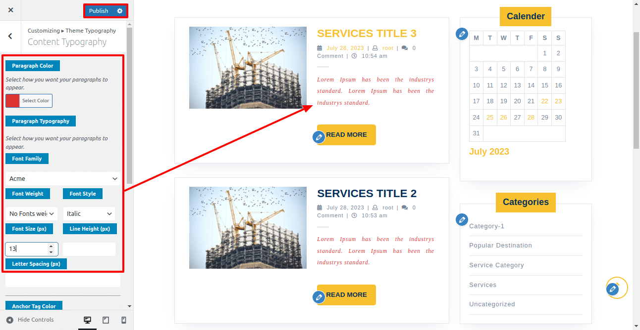 In Content Typography you can change color, font style, font-size, line height, font-weight, letter-spacing of Paragraph and Anchor tags.