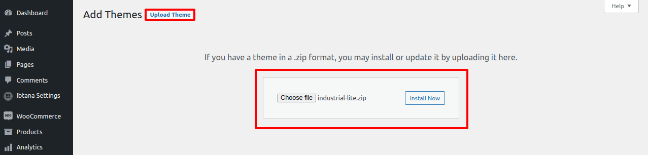 1.3. Press "Upload Theme" button then select your industrial-lite.zip theme then click on "install now".