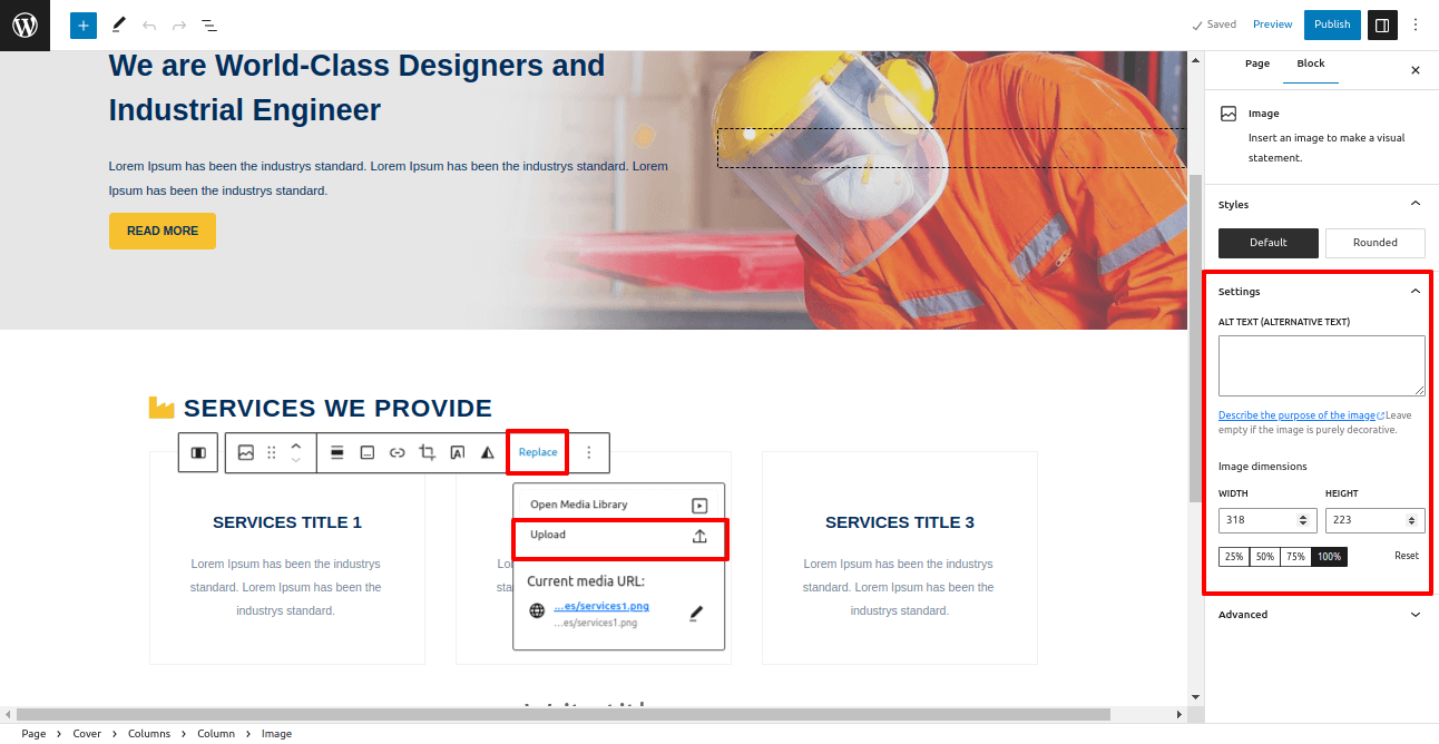 In this section, you can replace images and also change the image's dimension.