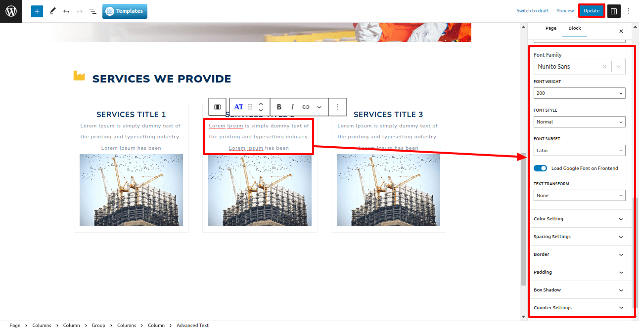 Add title icon, section title and select the category to display services.