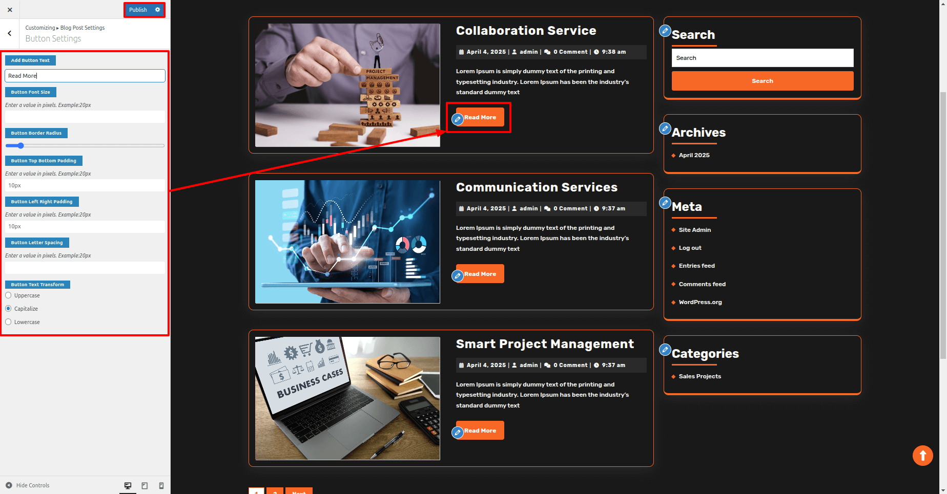 Go To Dashboard > Appearance > Customize > Blog Post Setting > Button Setting