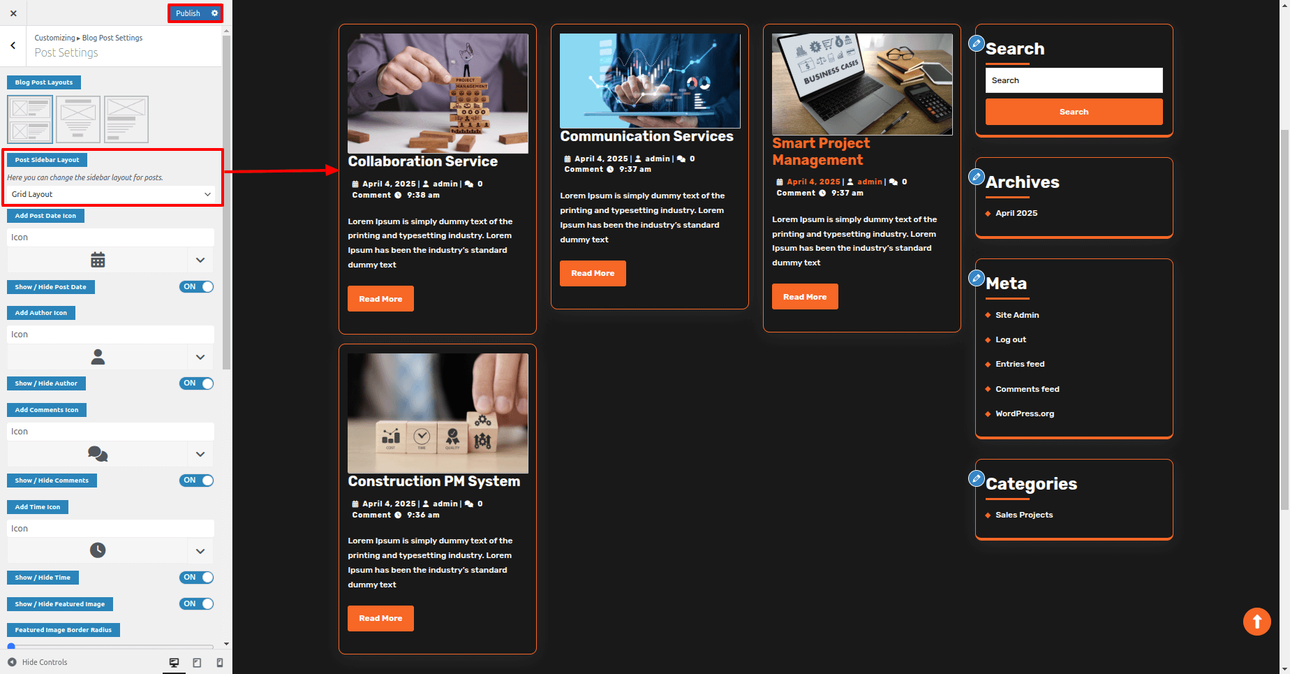 Go To Dashboard > Appearance > Customize > Blog Post Setting > Post Setting