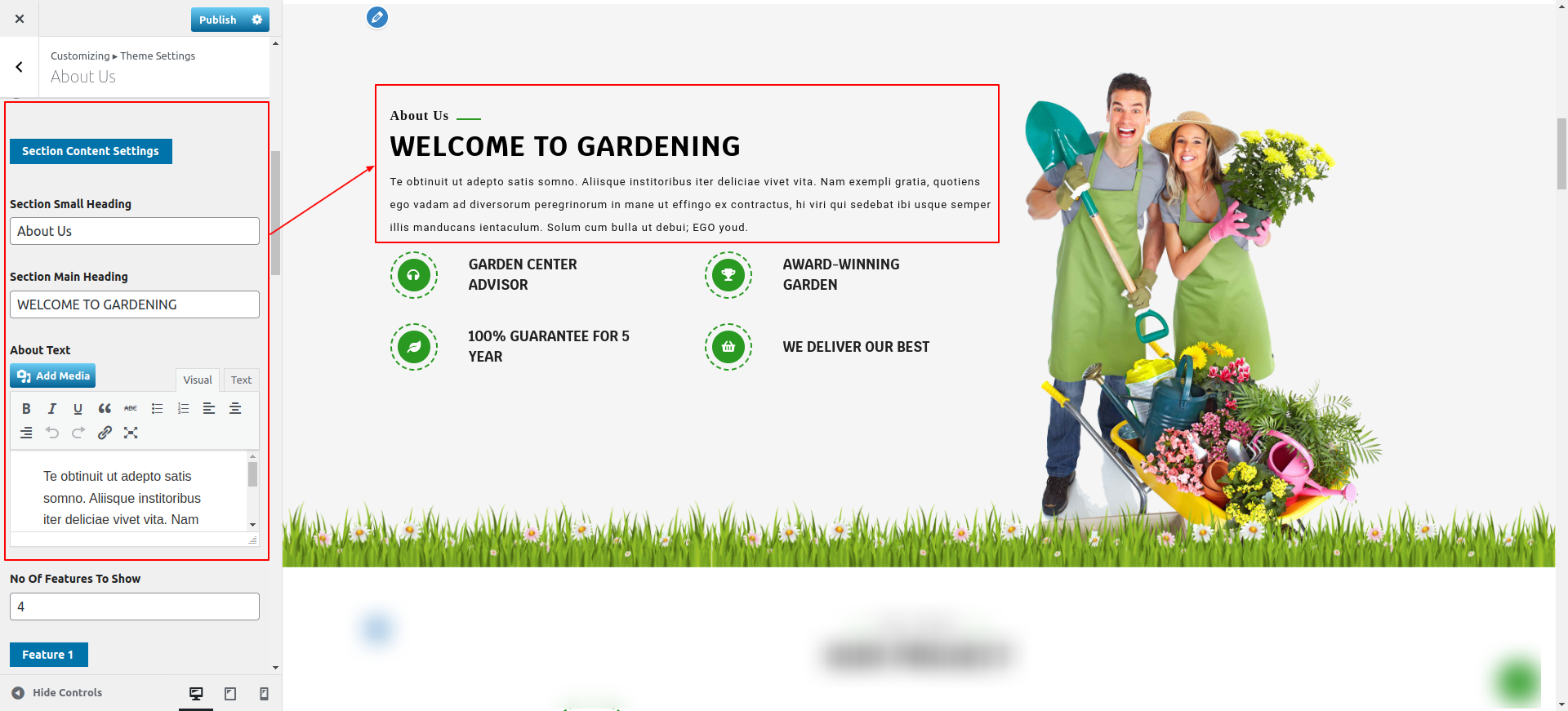 Go to Appearance >> Customize >> Theme Settings >> About Us Section