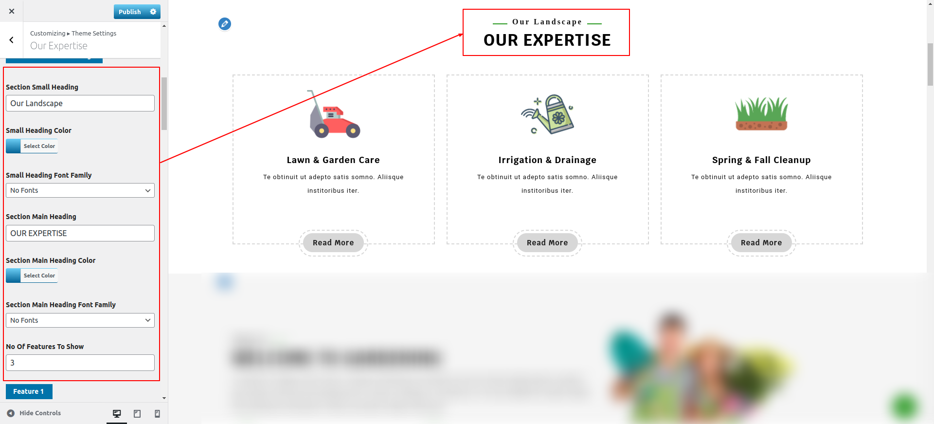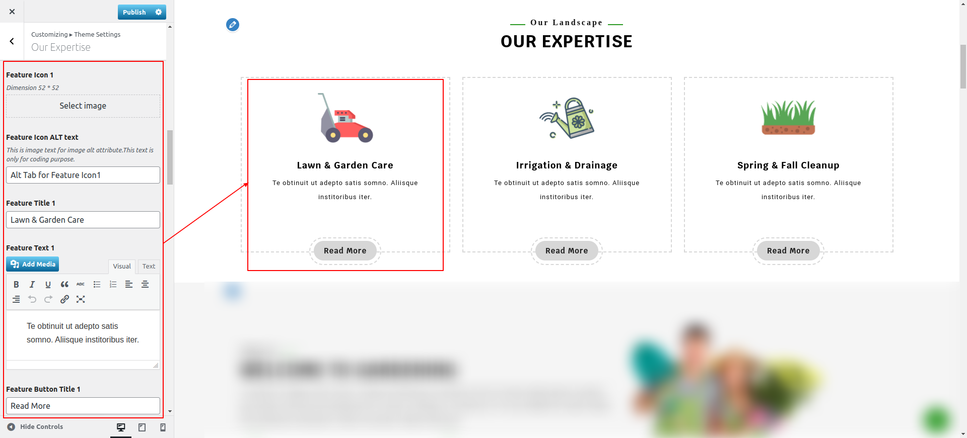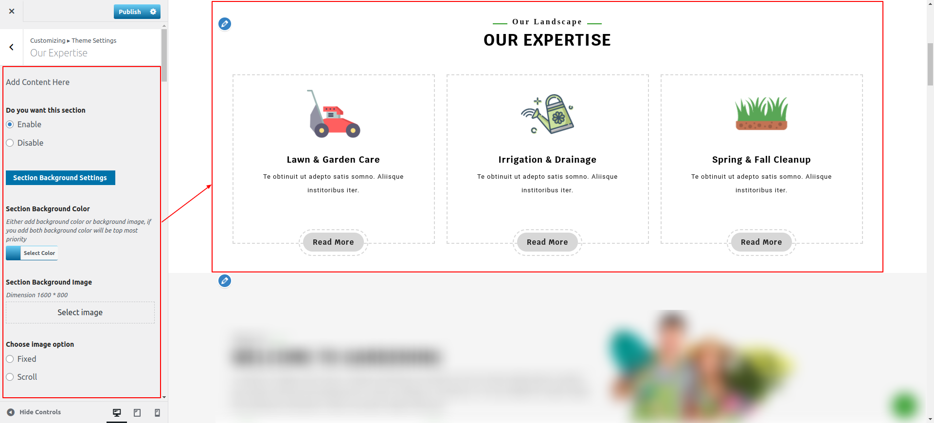Go to Appearance >> Customize >> Theme Settings >> Our Expertise Section