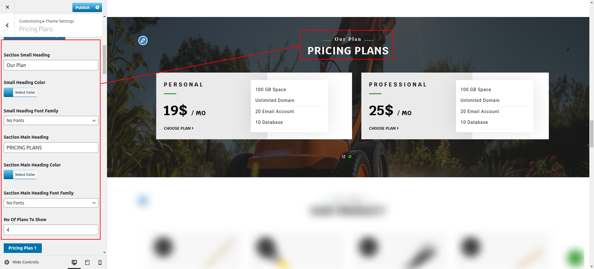 Go to Appearance >> Customize >> Theme Settings >> Pricing Plans Section.