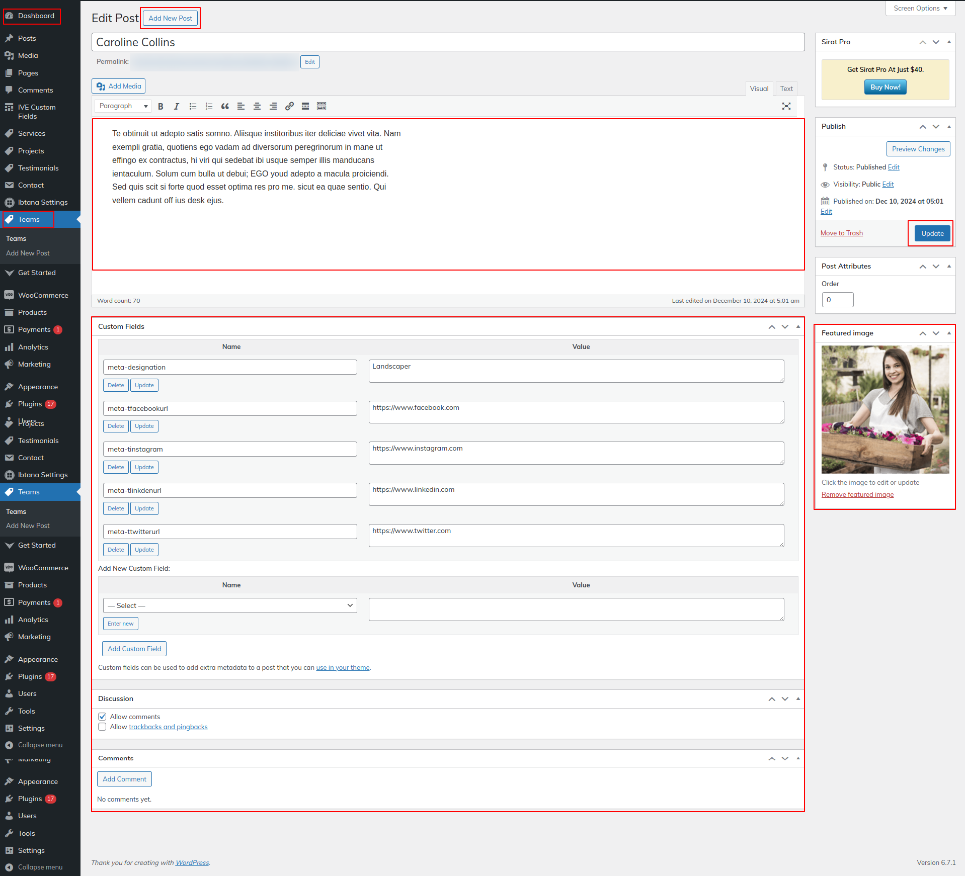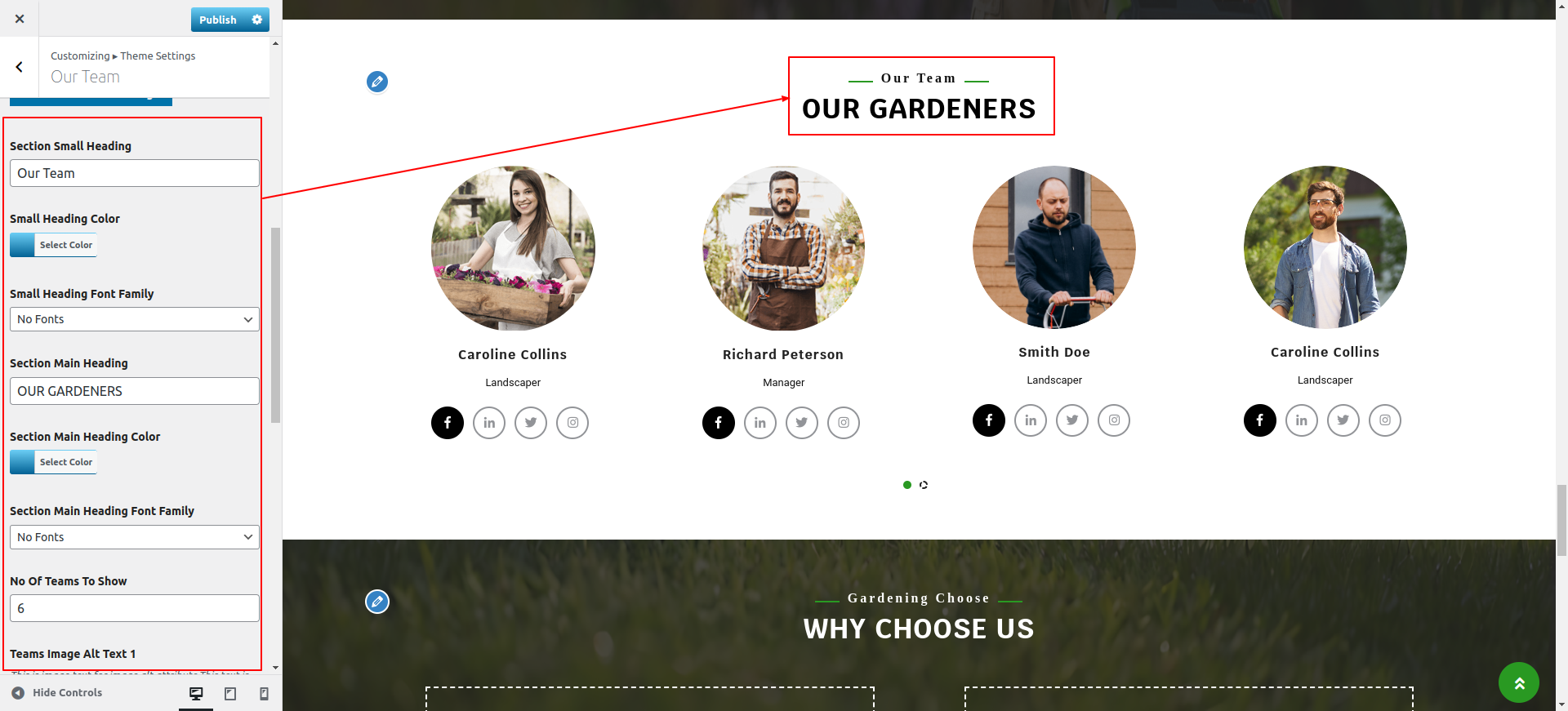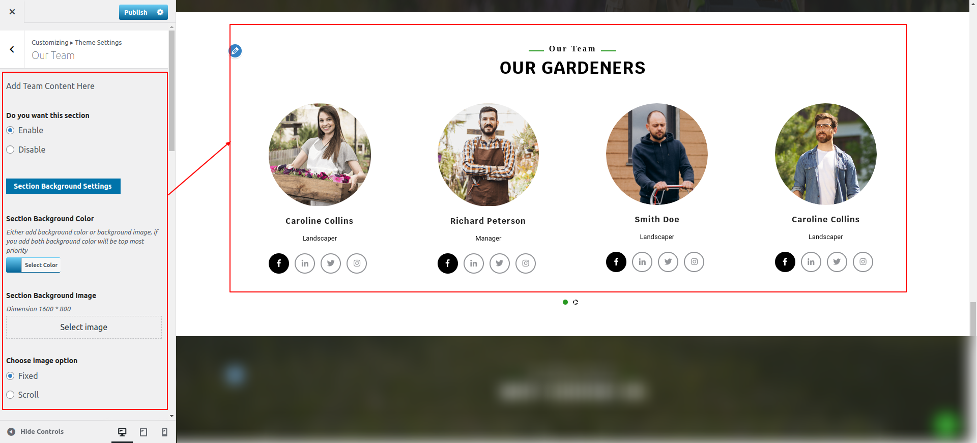 Observe these instructions to set up Our Team Section.