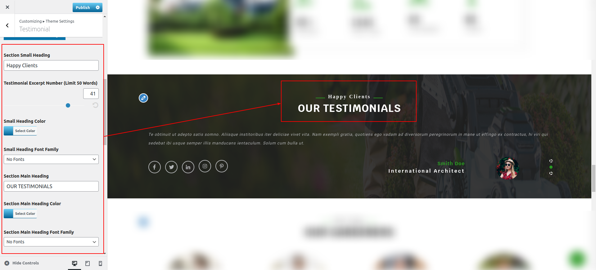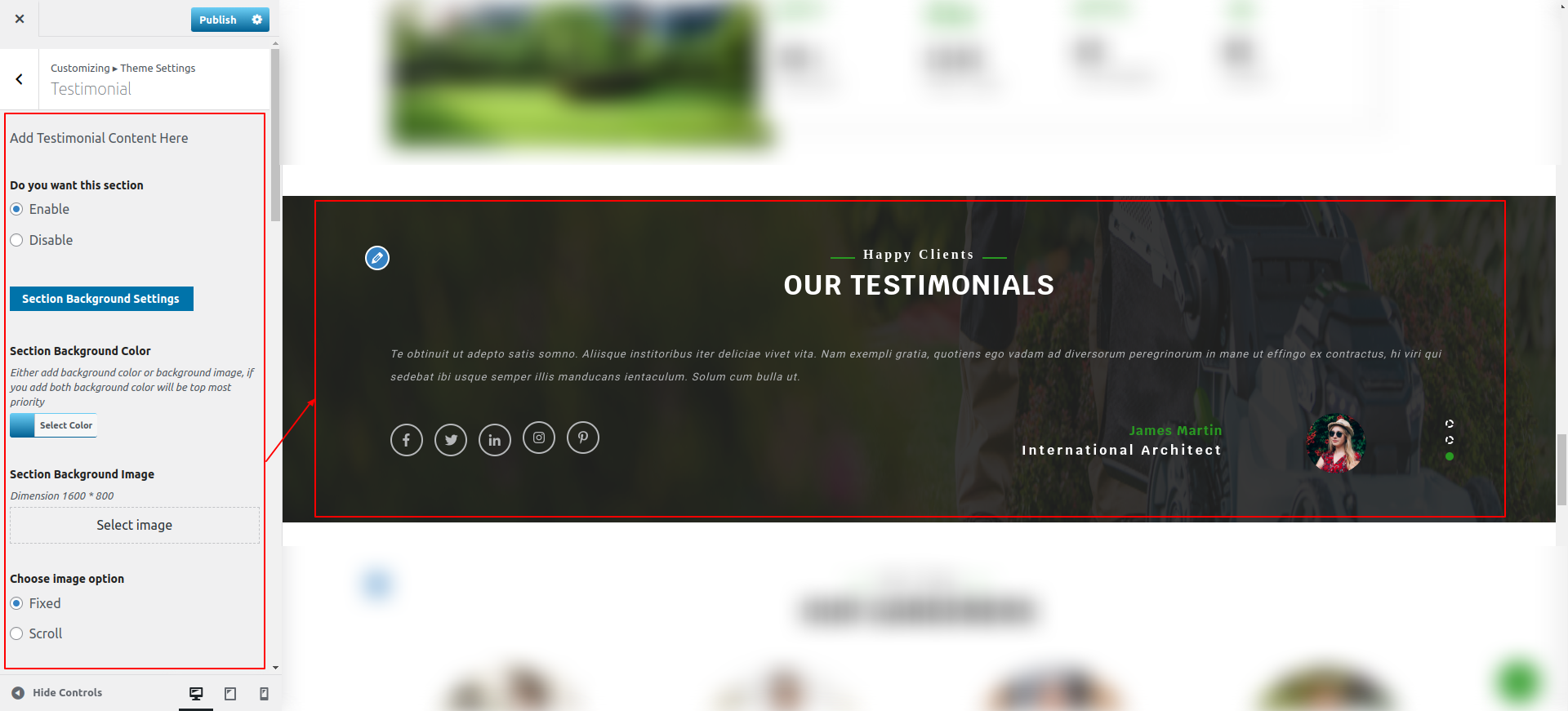 Observe these instructions to set up Testimonials Section.