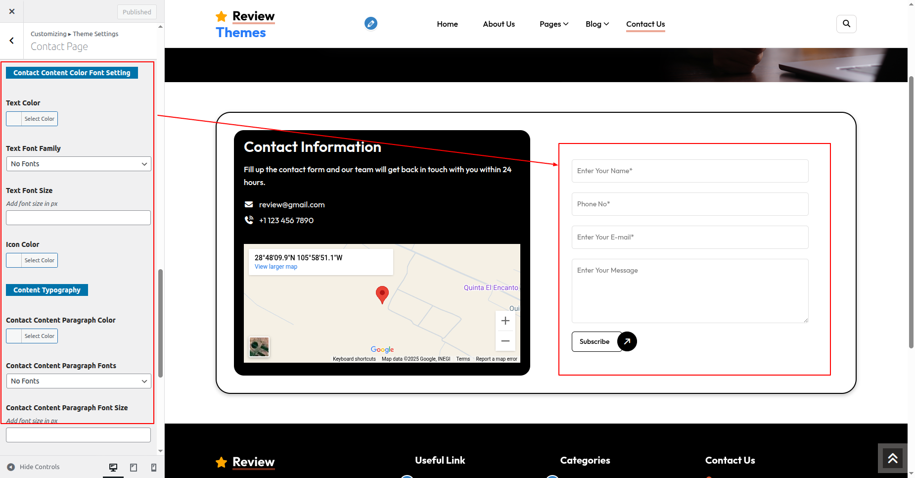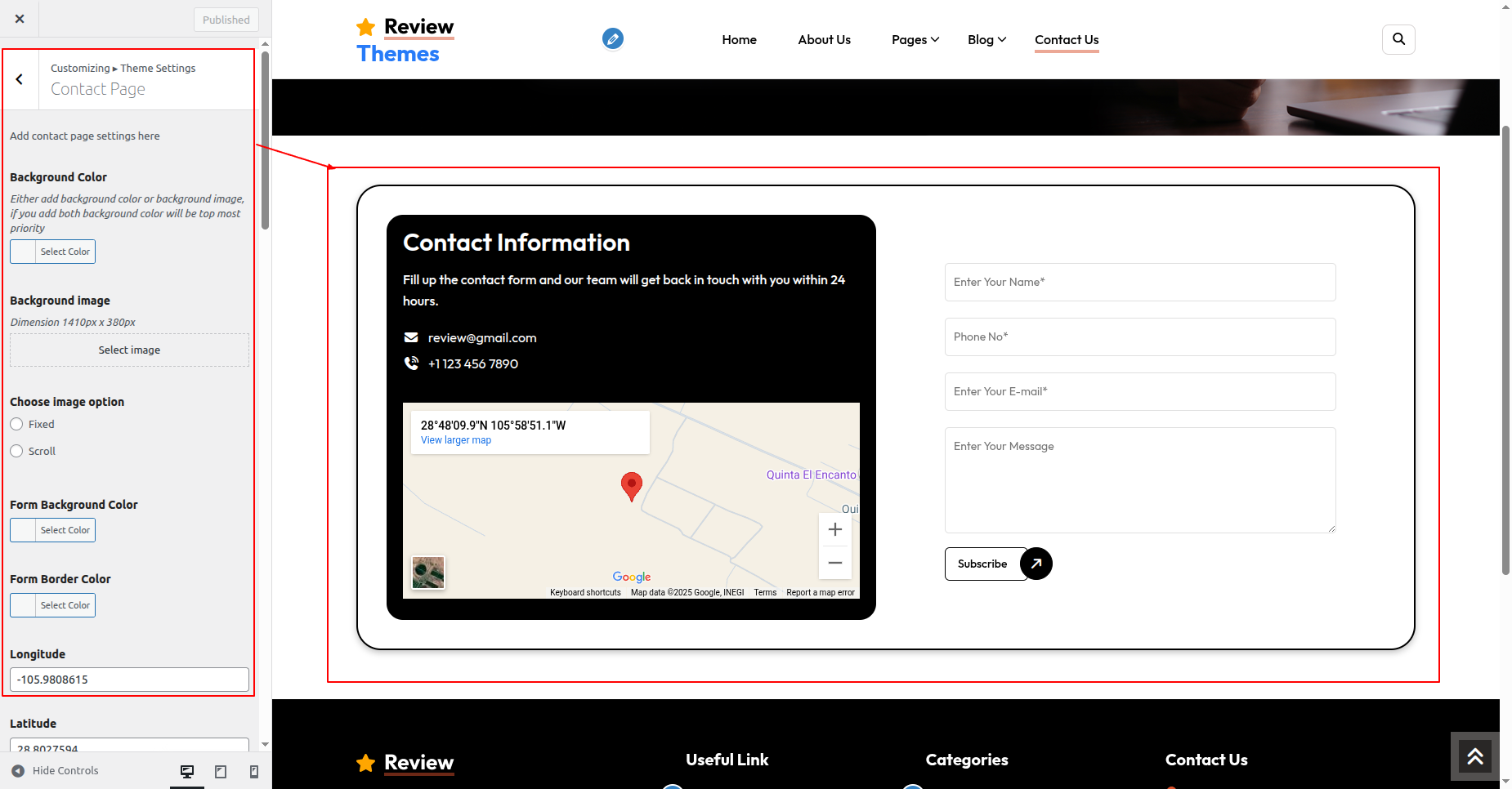 Go to Appearance >> Customize >> Theme Settings >> Contact Page
