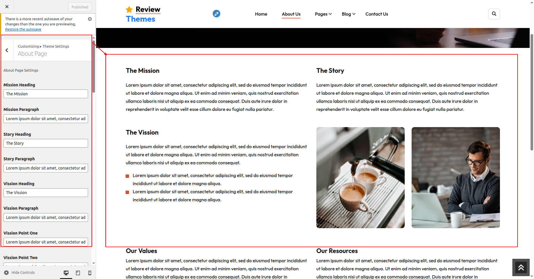 Go to Appearance >> Customize >> Theme Settings >> About Page Settings