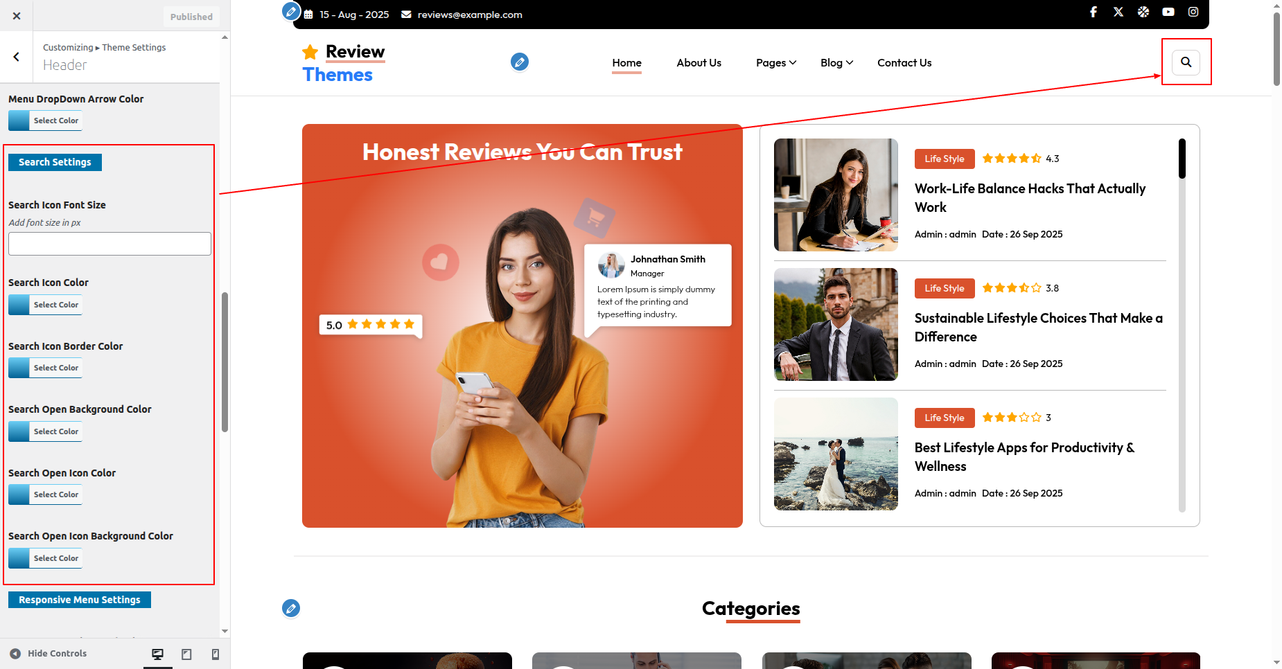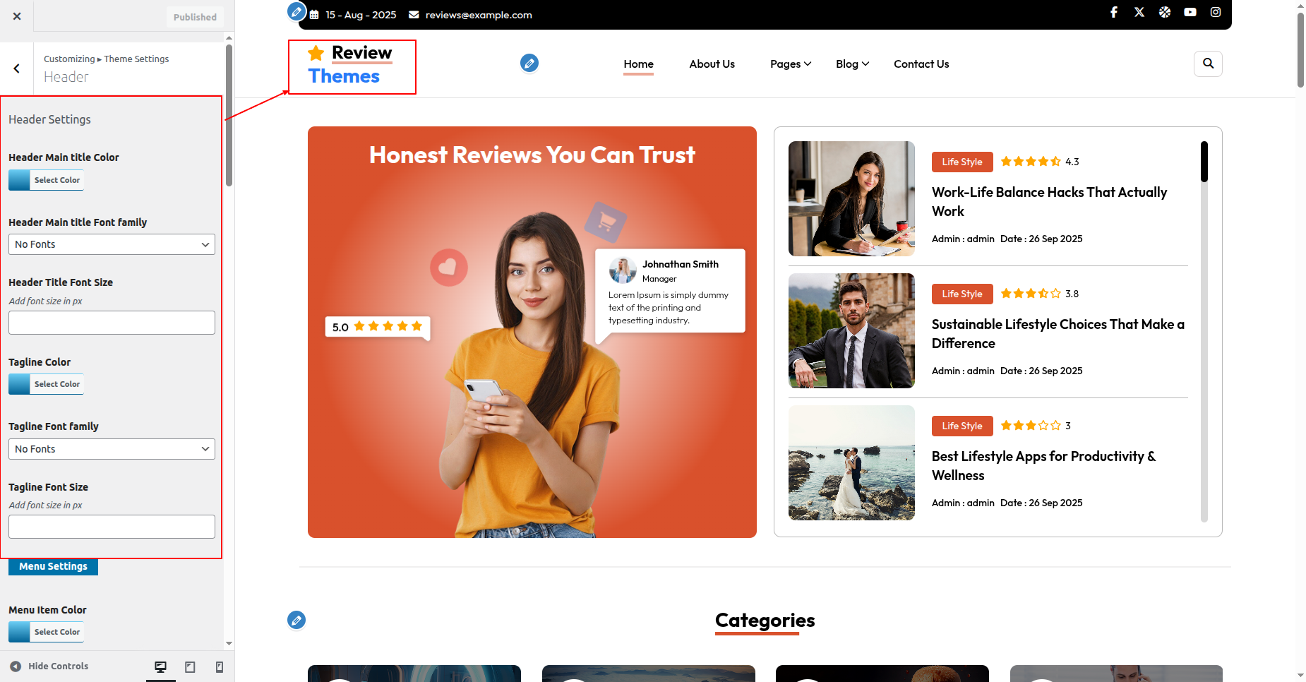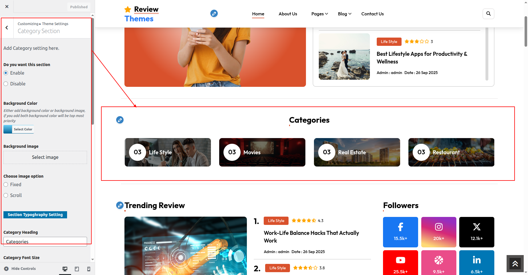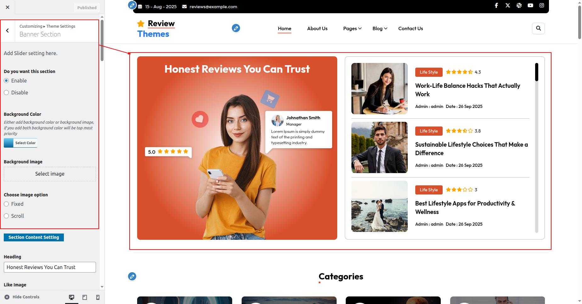 Go to Appearance >> Customize >> Theme Settings >>New Review Section