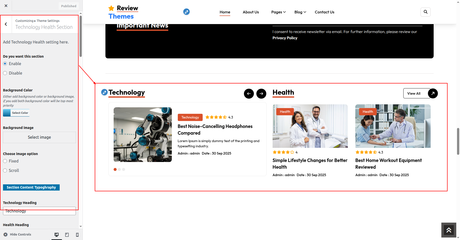 Go to Appearance >> Customize >> Theme Settings >>Technology Health