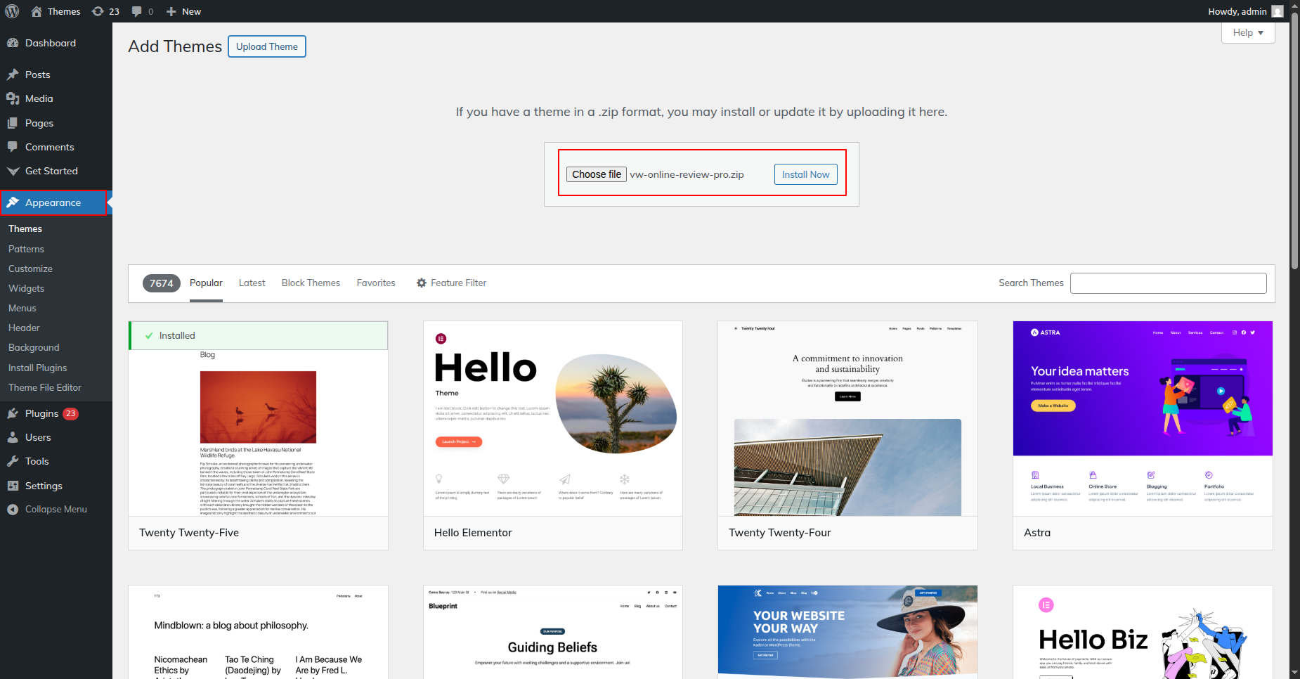 1-Using WordPress admin, install a theme.