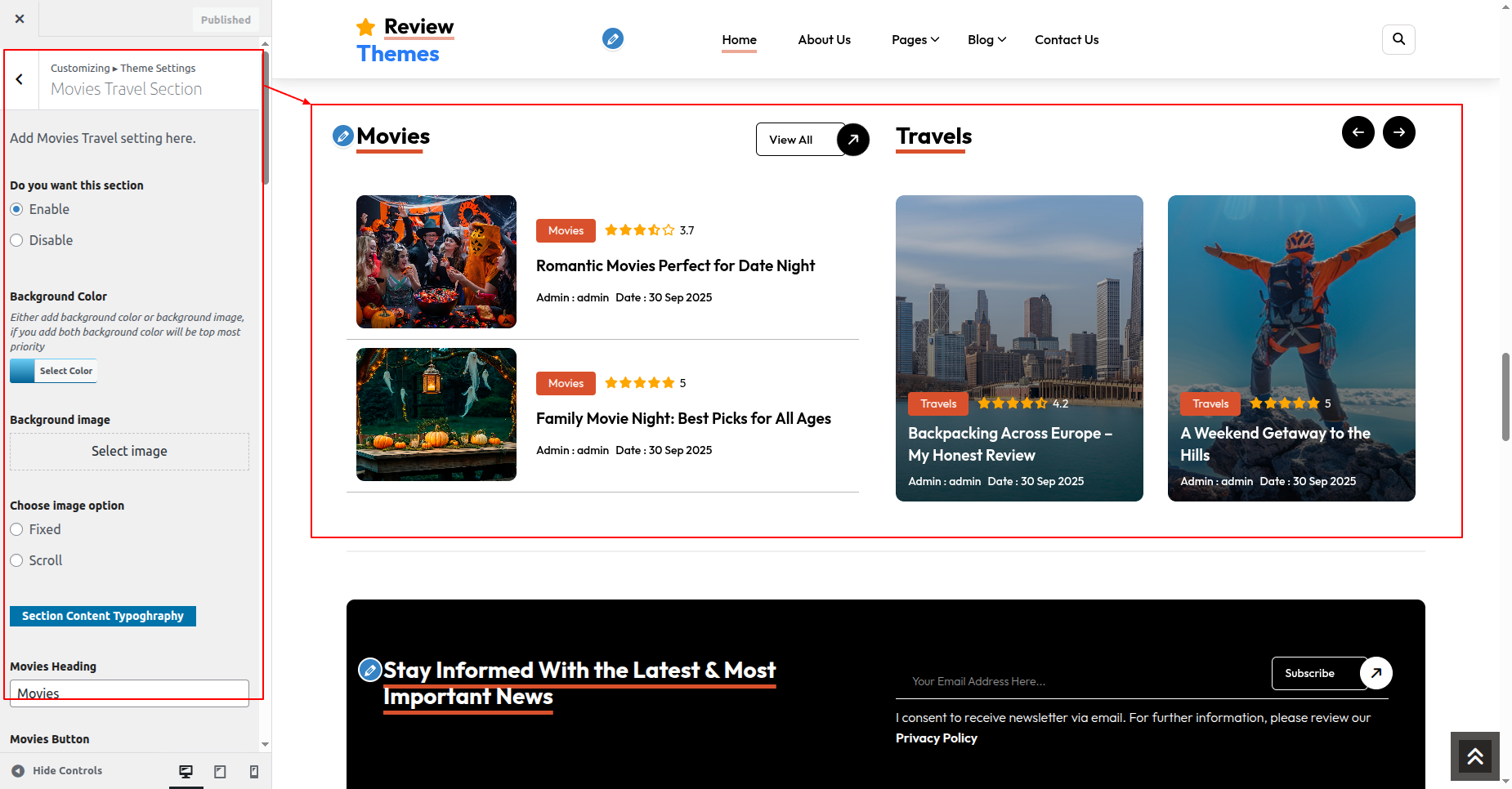 Go to Appearance >> Customize >> Theme Settings >>Movies Travel