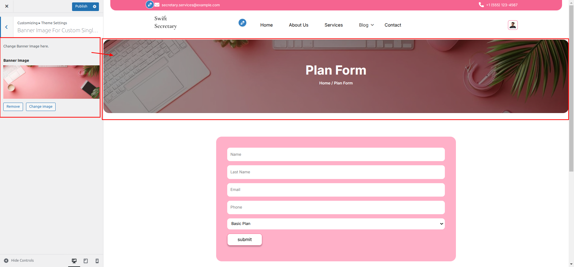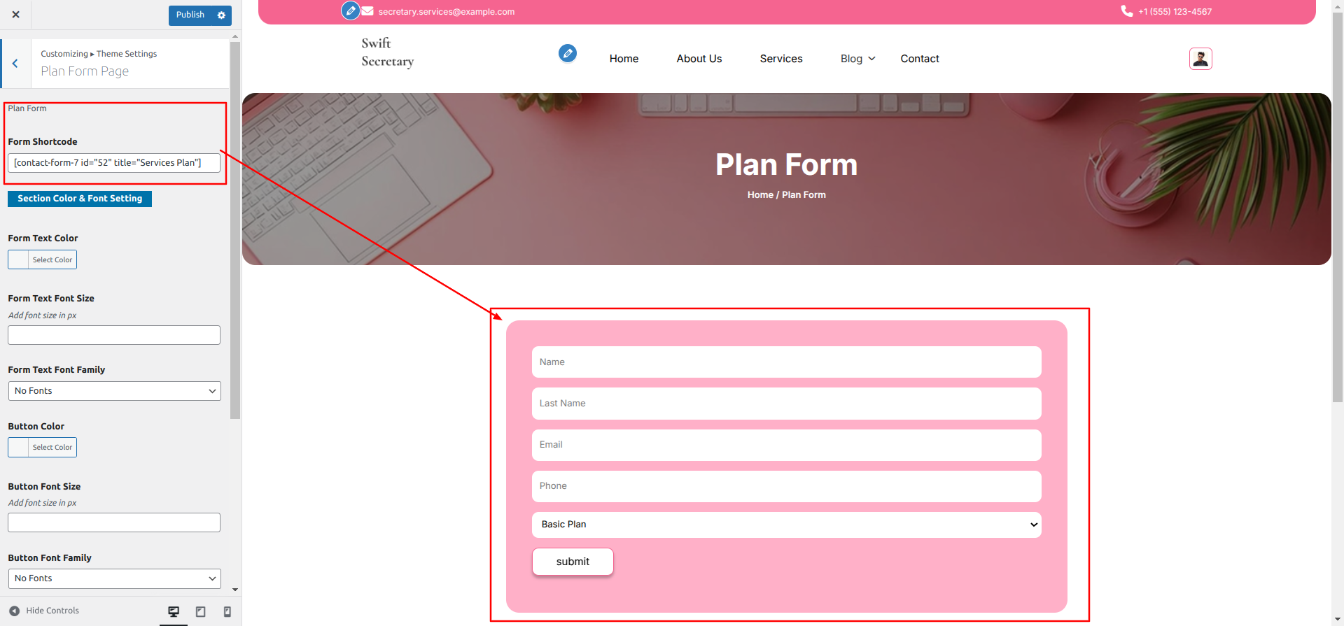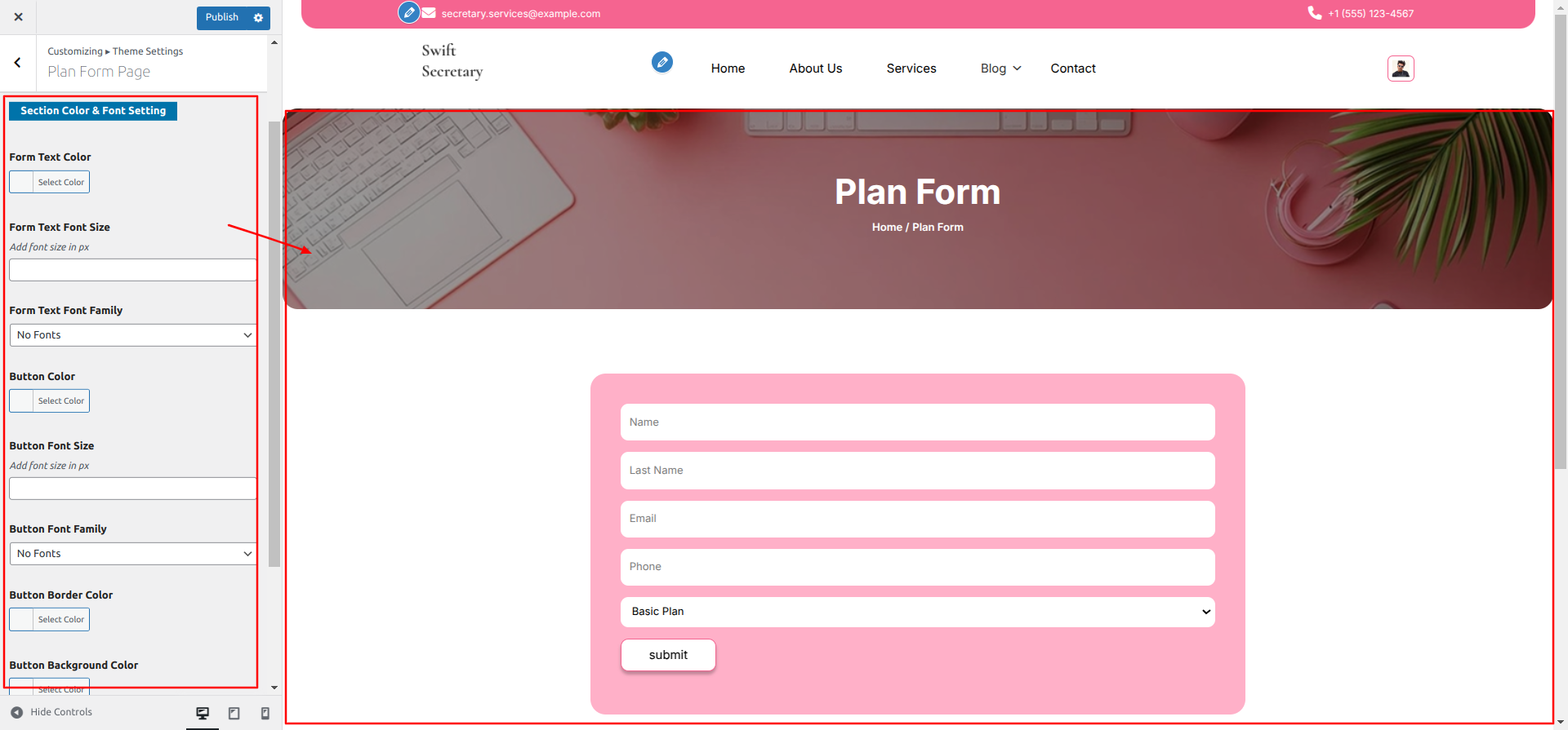 Go to Appearance >> Customize >> Theme Settings >> Plan Form Page