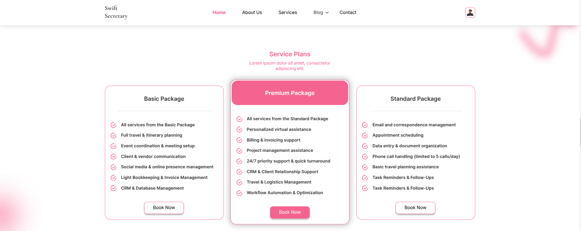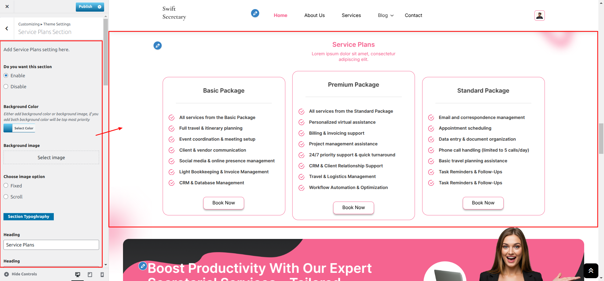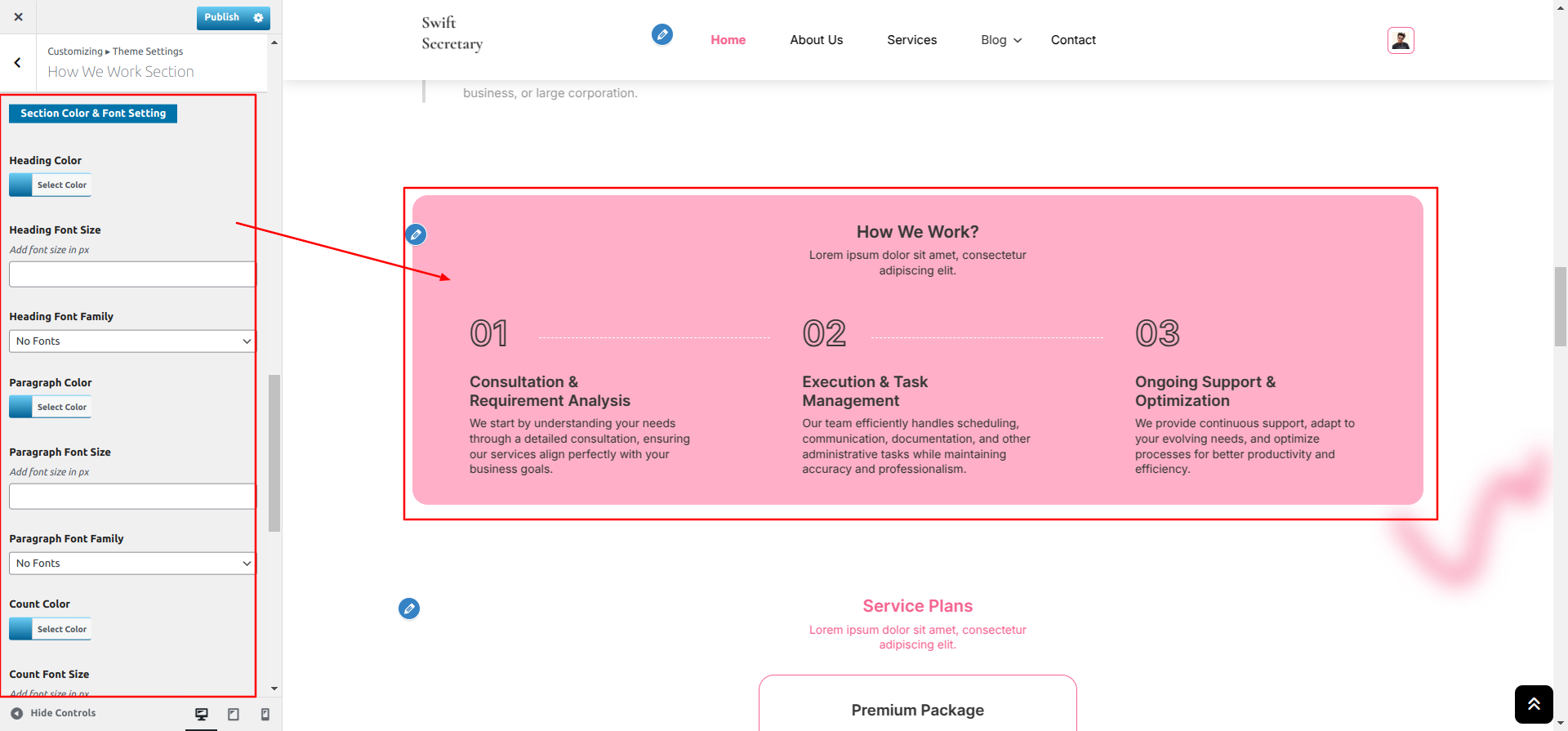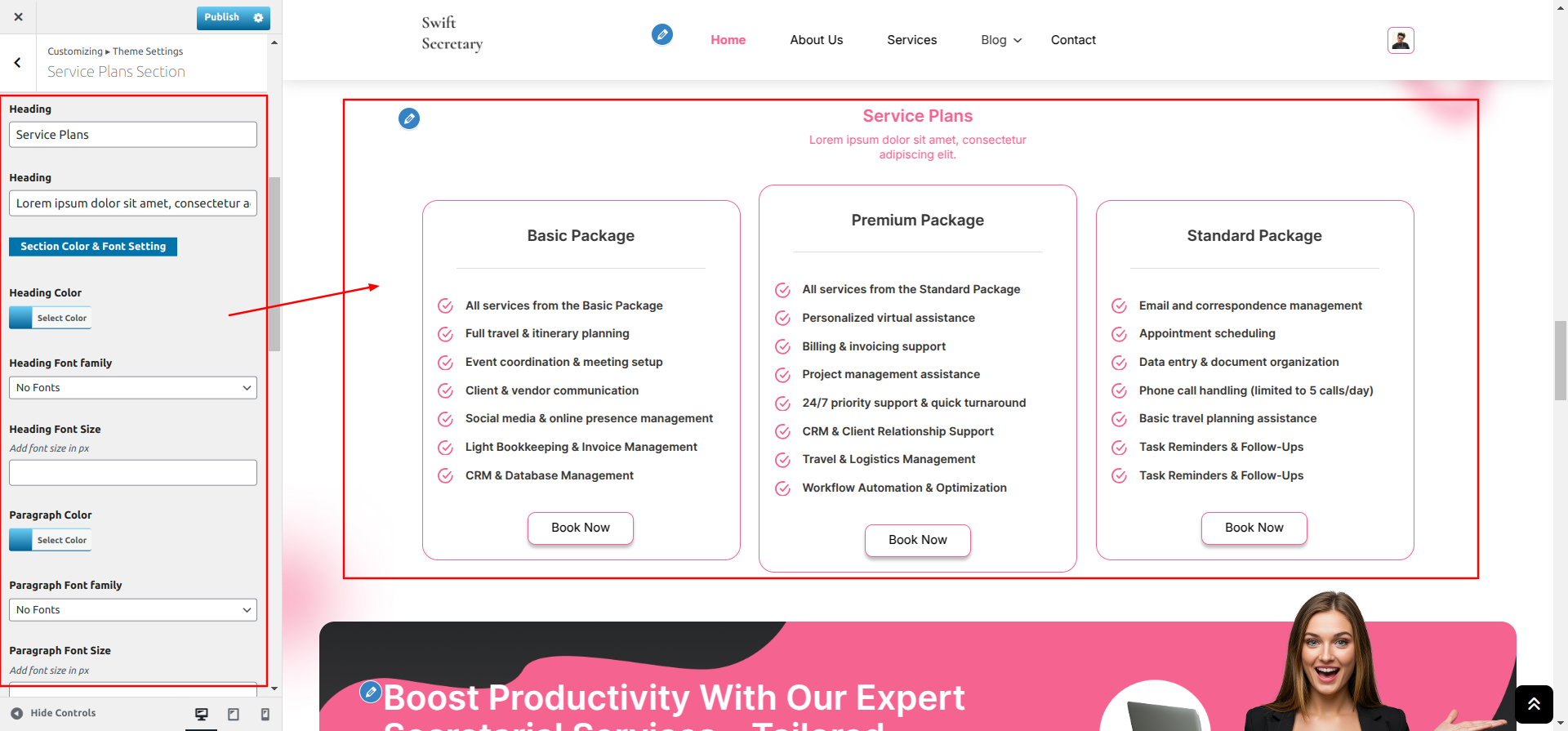 Go to Appearance >> Customize >> Theme Settings >> Service Plans Section