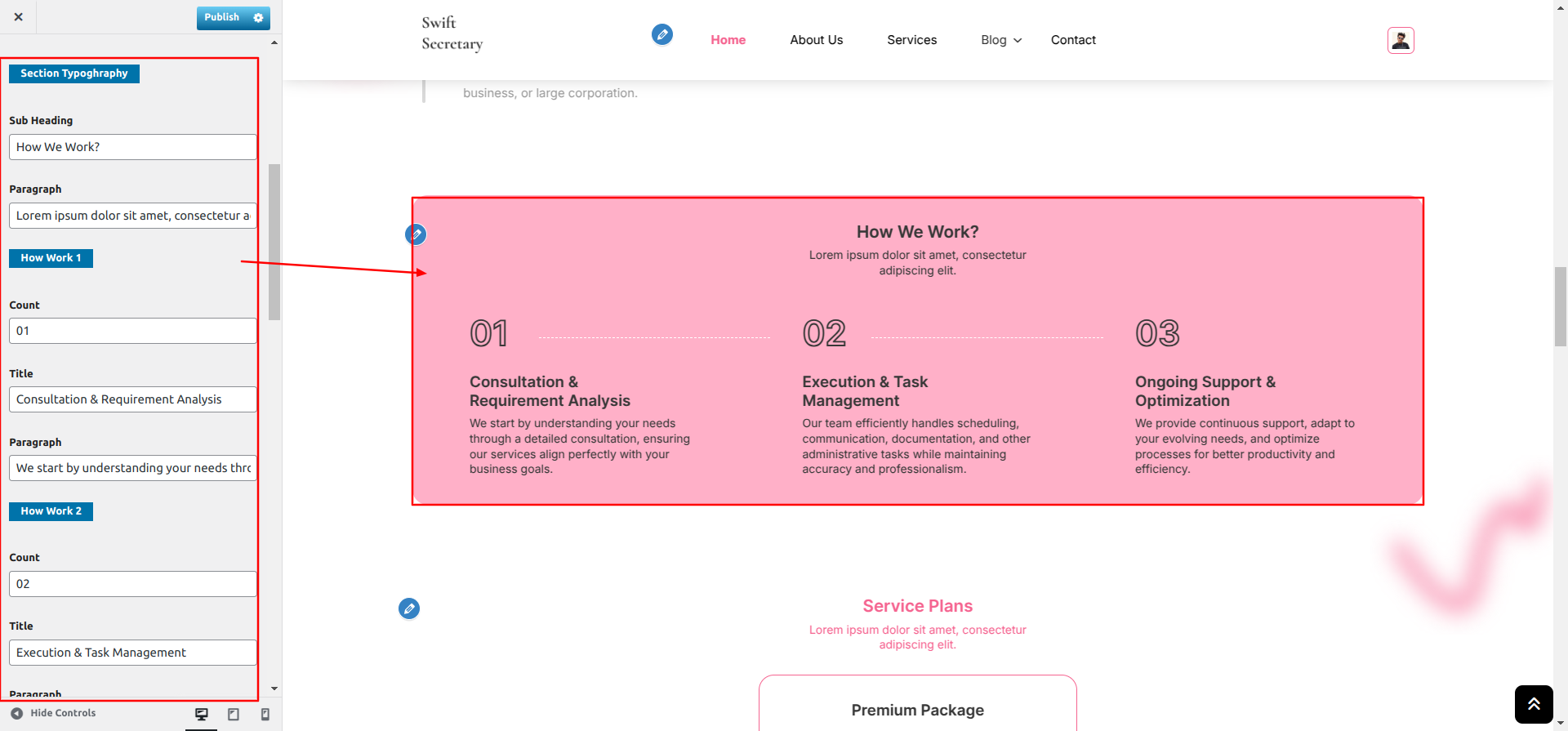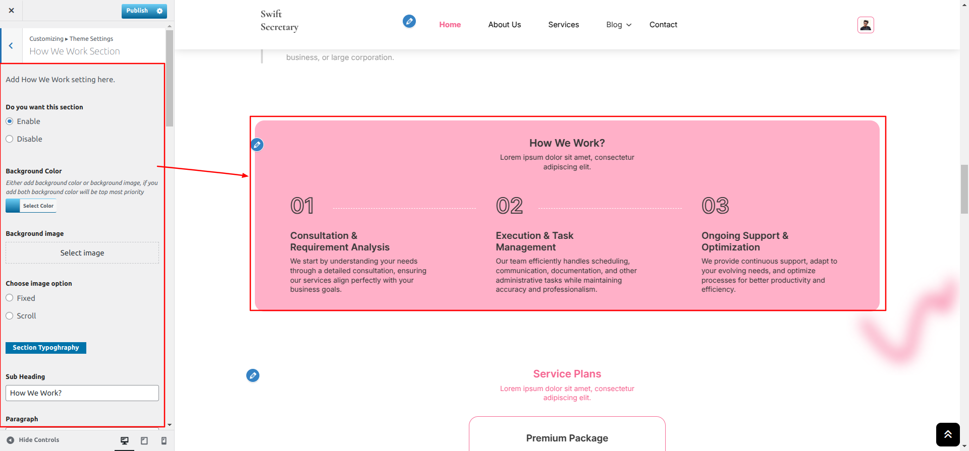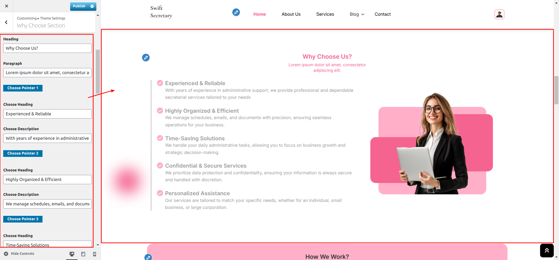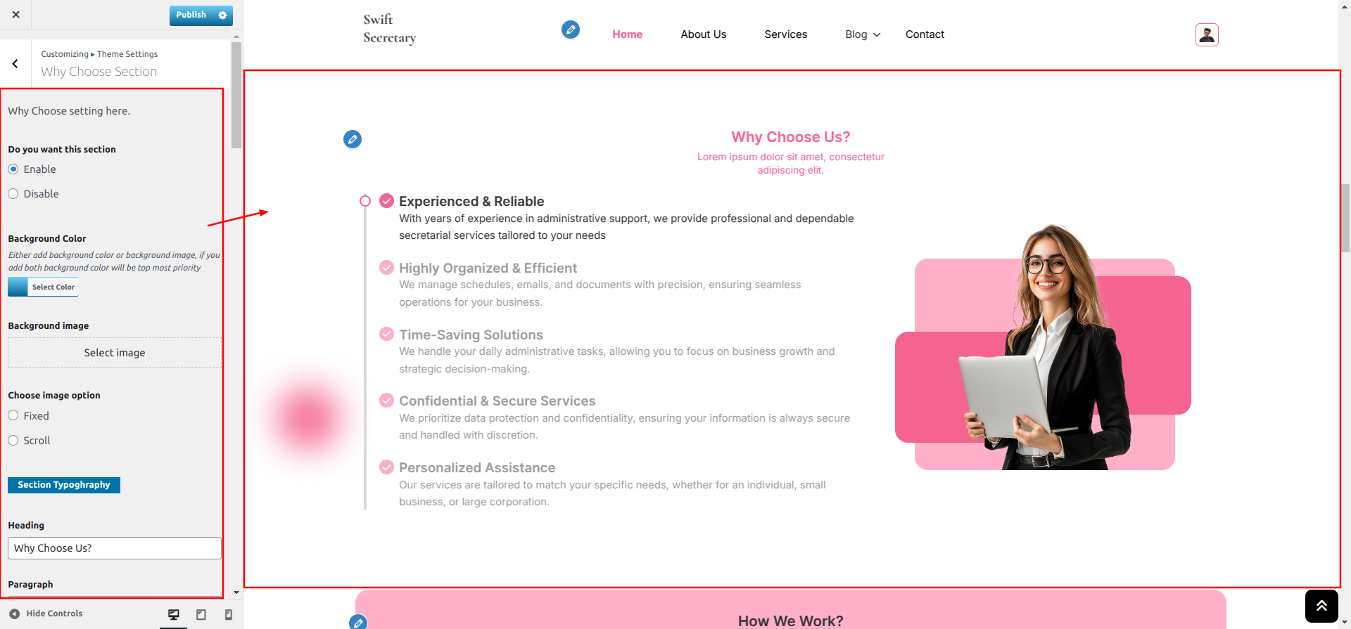 Go to Appearance >> Customize >> Theme Settings >> How We Work Section