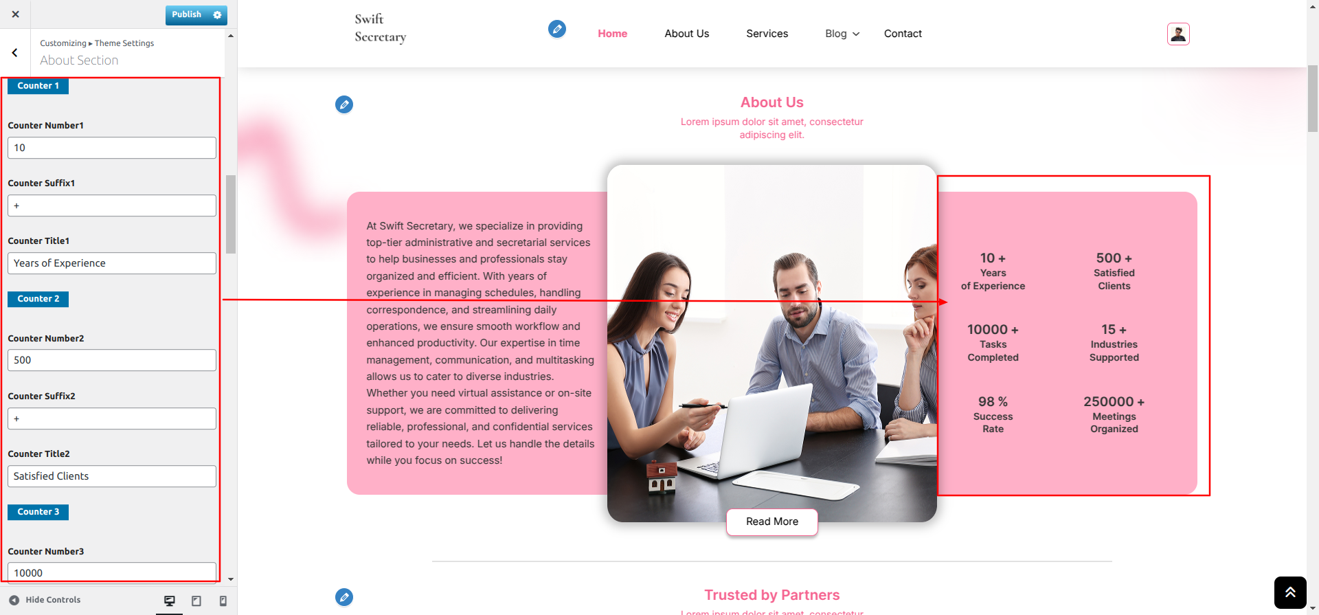 Go to Appearance >> Customize >> Theme Settings >> Partners Section