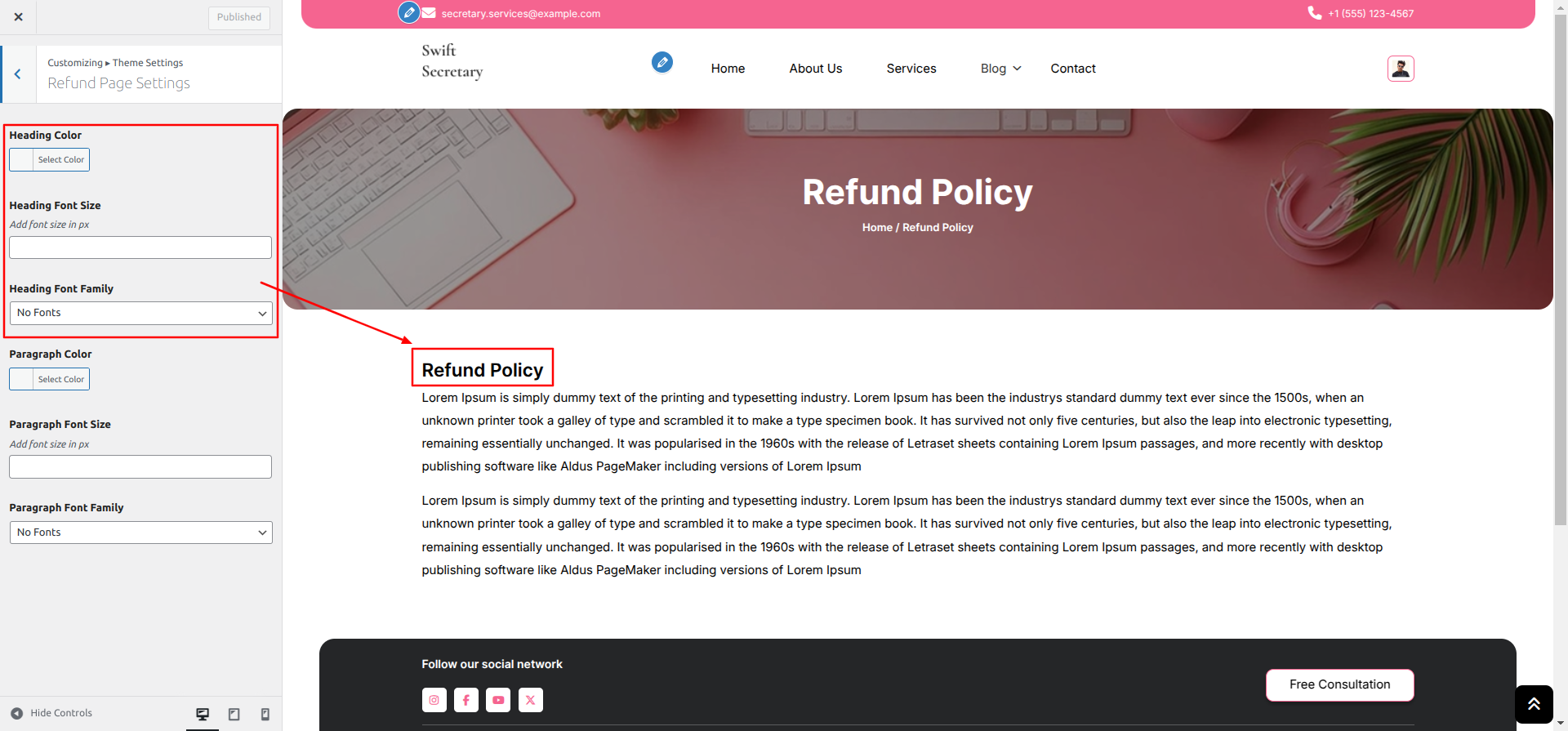 Go to Appearance >> Customize >> Theme Settings >> Refund Page Settings