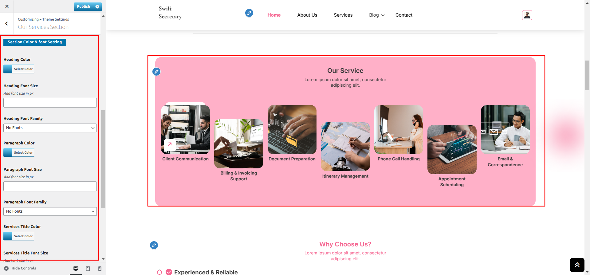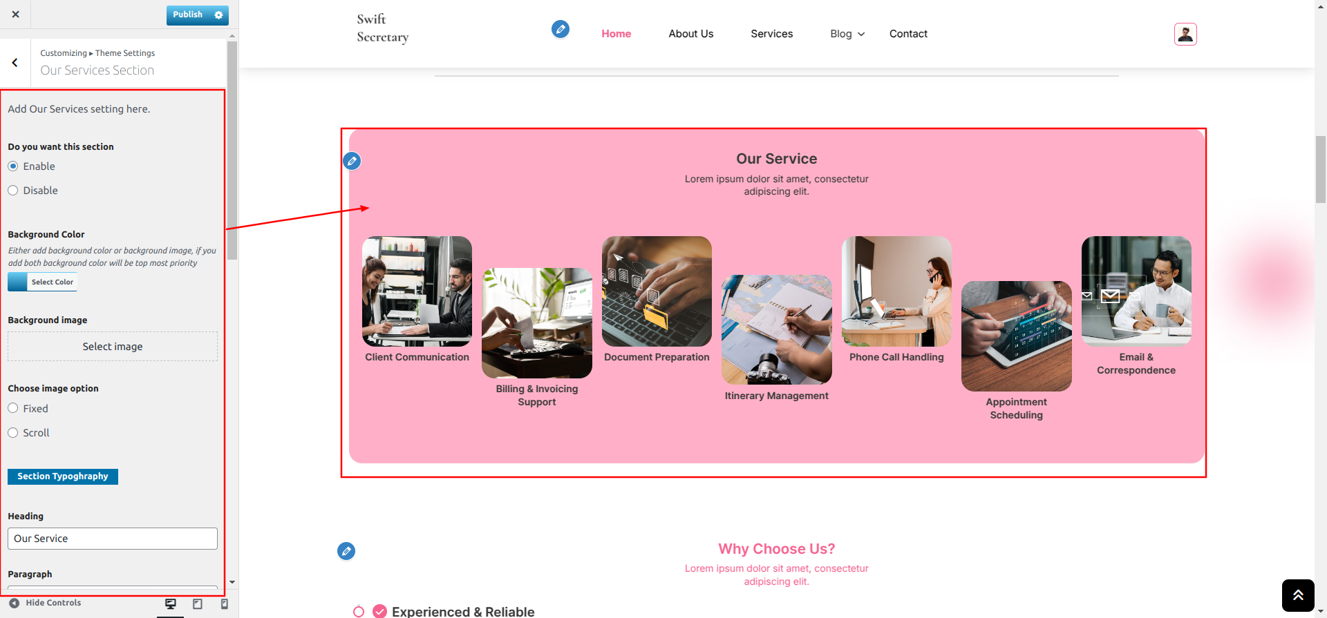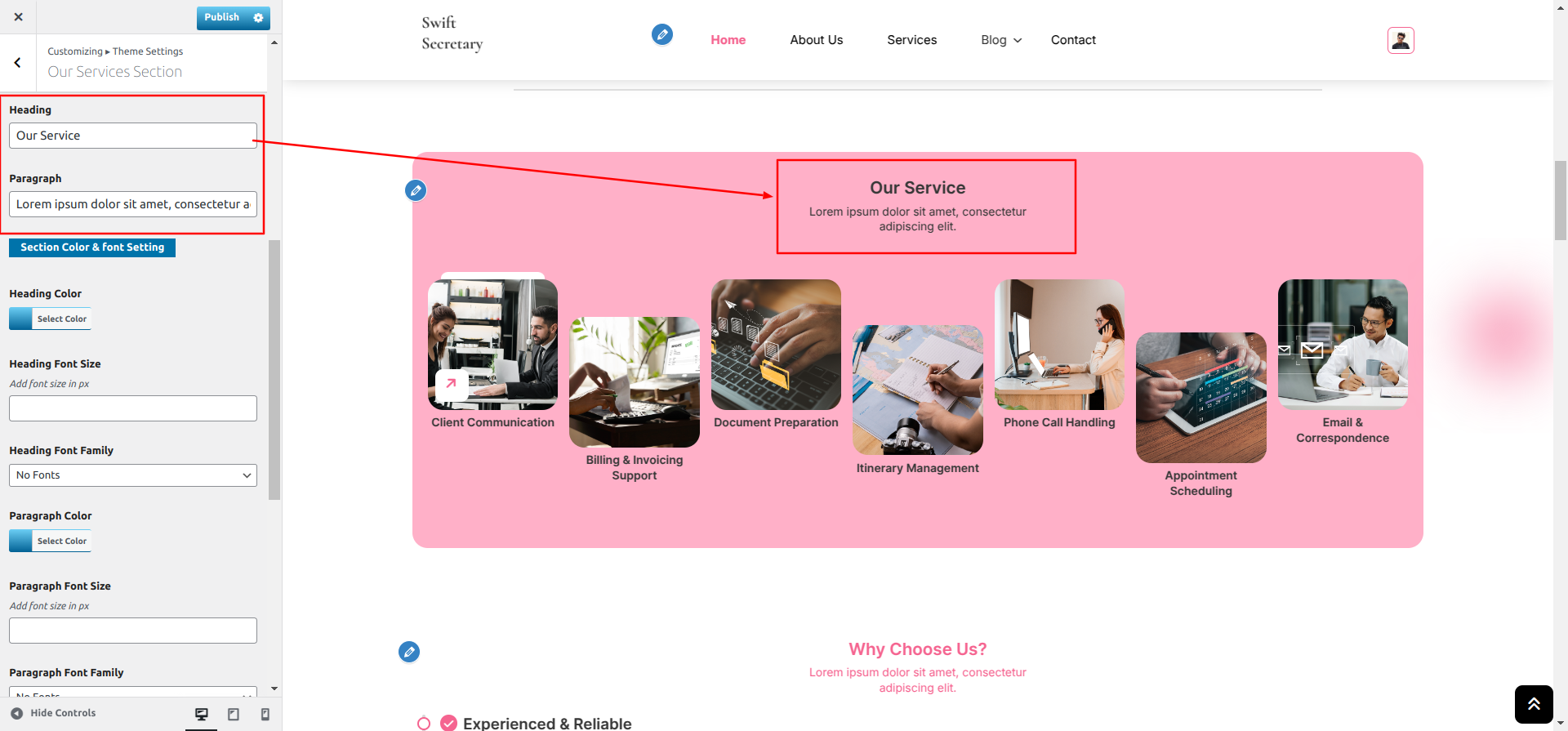 Go to Appearance >> Customize >> Theme Settings >> Why Choose Section